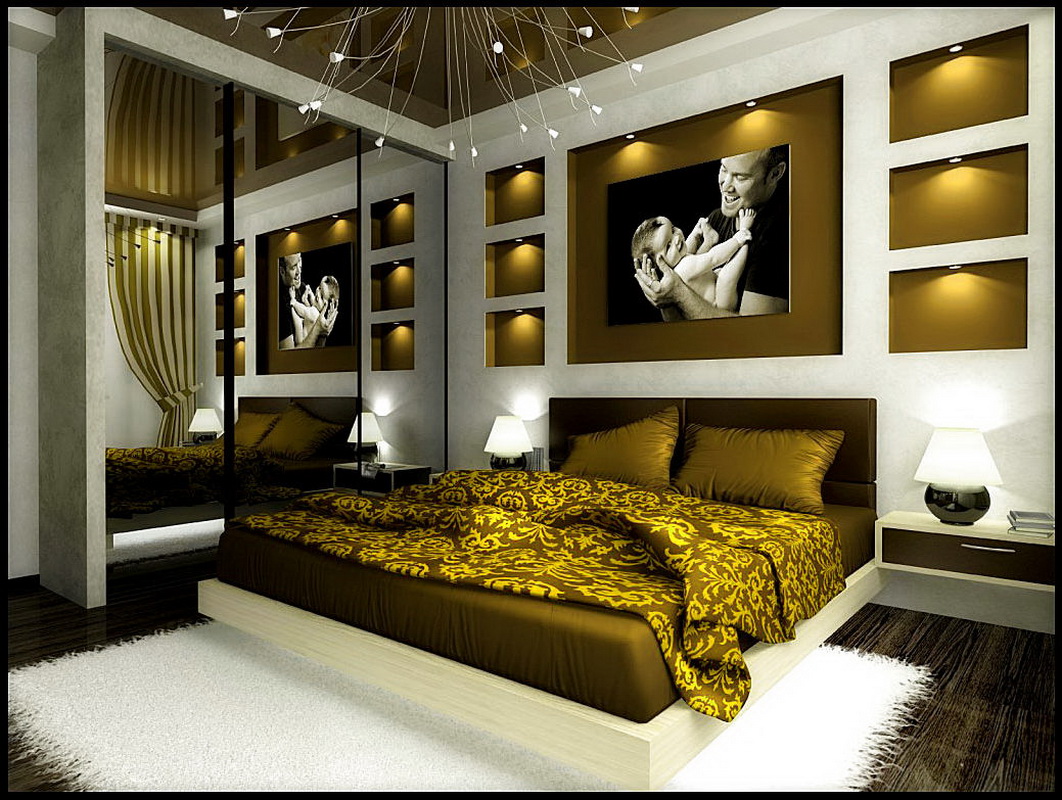 Pilihan yang agak baik ialah di mana tembok-tembok selesai, contohnya, dengan plaster hiasan dan ditutup dengan warna biru tua, siling berwarna putih, dan lantai boleh berwarna coklat atau kelabu muda. Cermin di pintu almari gelongsor atau dinding cermin di kepala kepala katil, semua ini akan meningkatkan secara signifikan mana-mana bilik.
