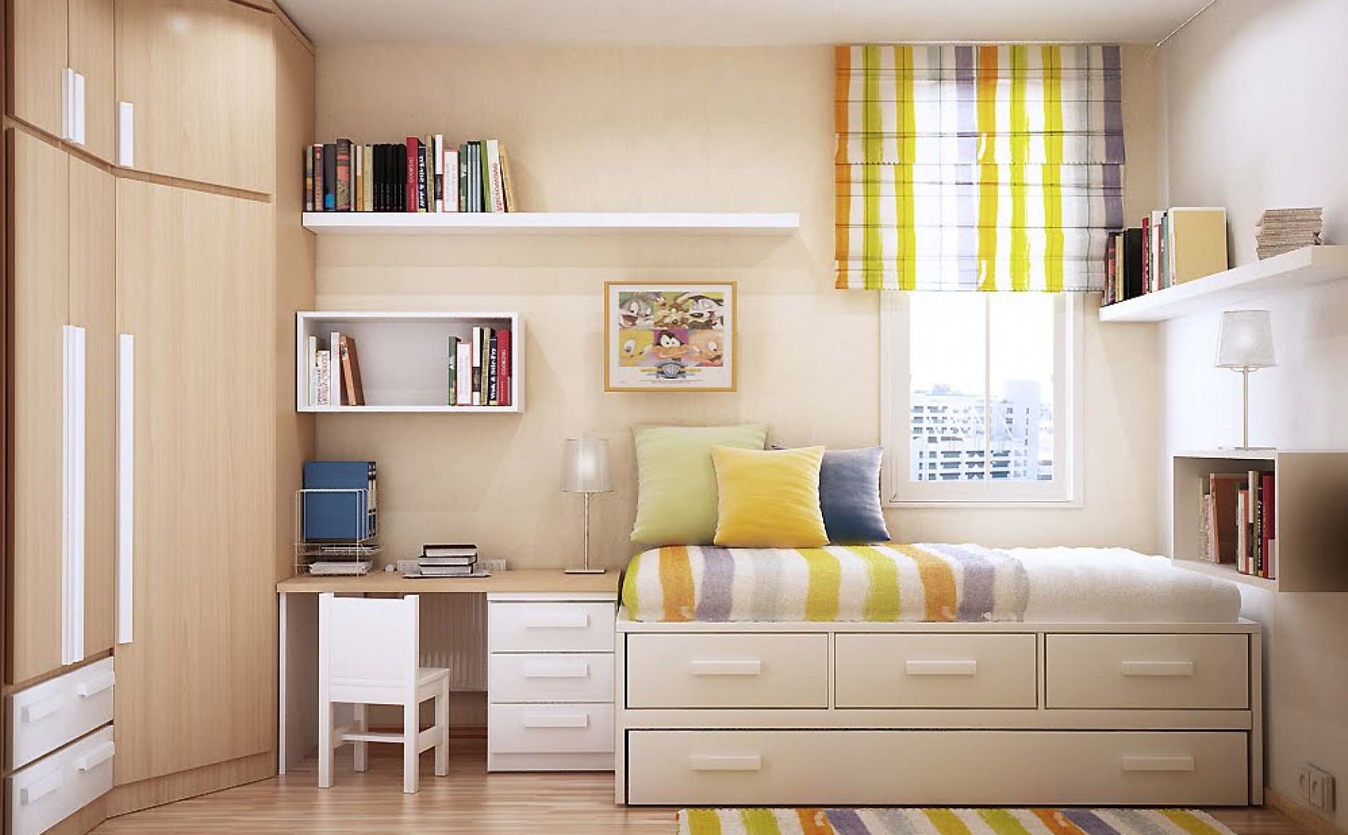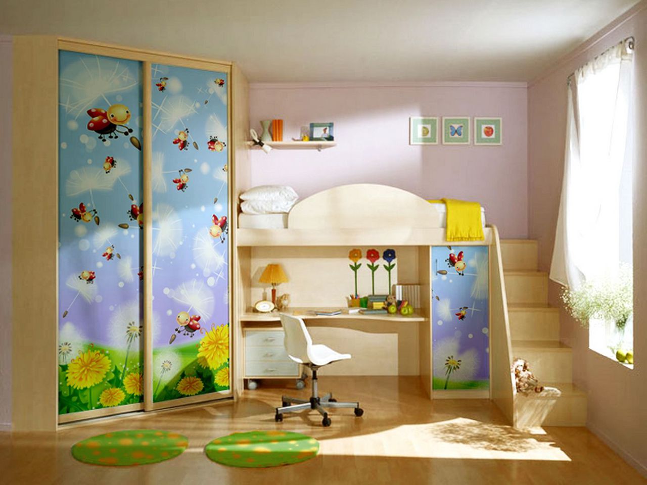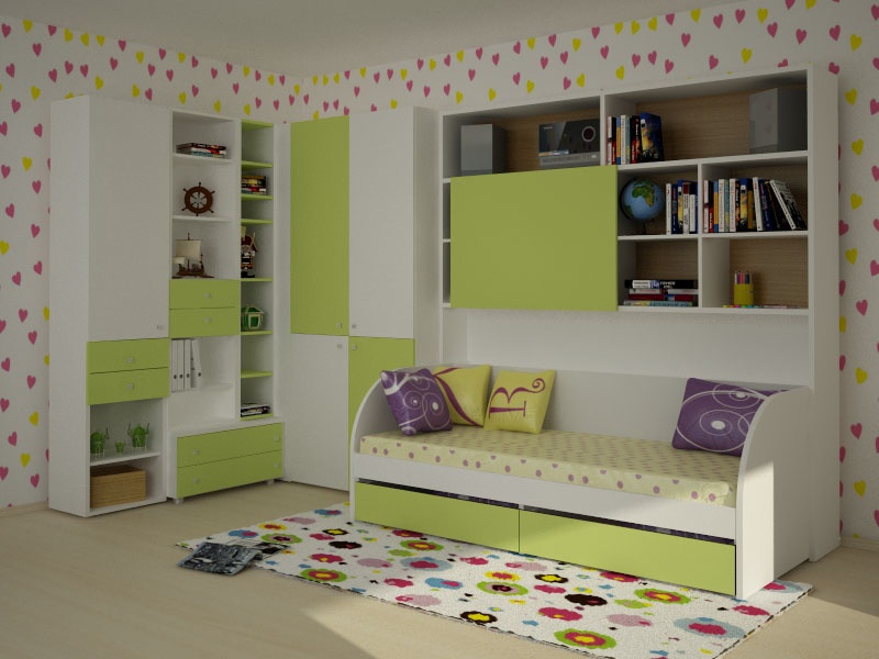 Dit is een geweldig idee, omdat het bed de hele dag in de ochtend wordt schoongemaakt, waardoor veel ruimte wordt vrijgemaakt. Het plaatsen van een dergelijke kast in de kinderkamer, ten eerste, vermindert het risico op letsel en ten tweede, bespaart ruimte.