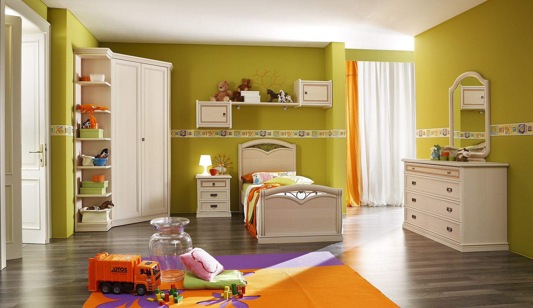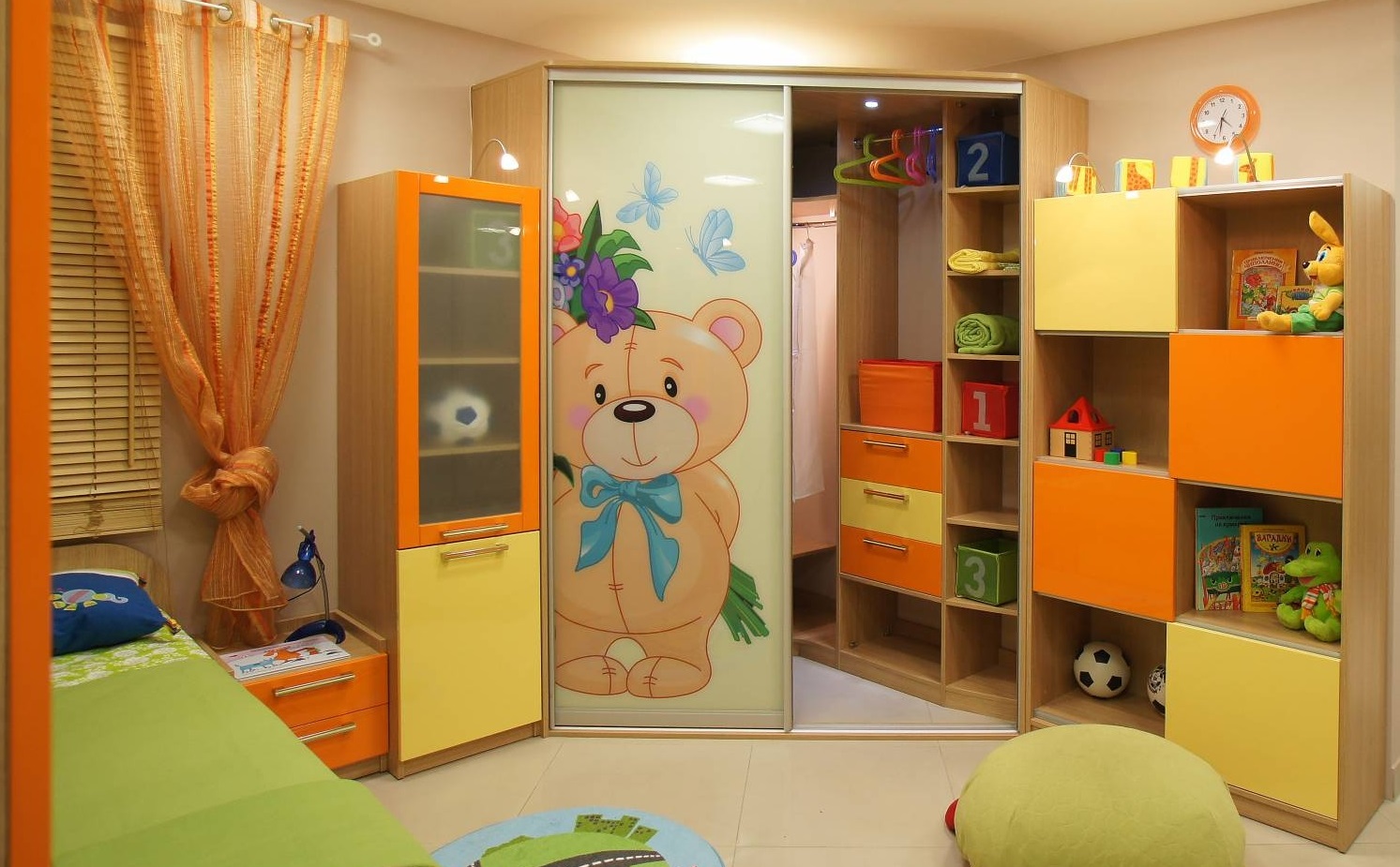 Foto's van het interieur van de kinderkamer met een hoekkast