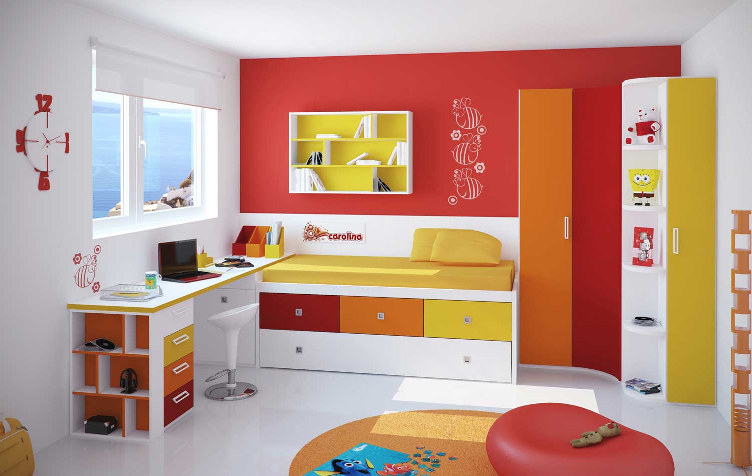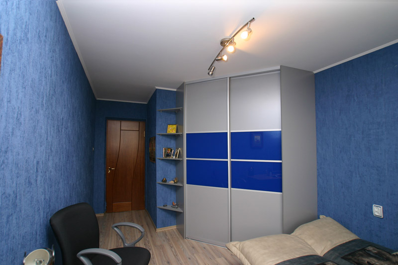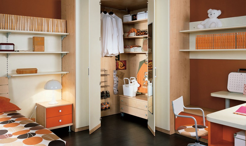 De kledingkast voor de jongen moet beknopter zijn in gedempte kleuren (blauw, groen, oranje).