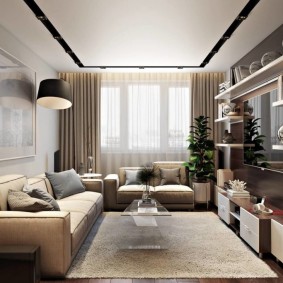 Vandaag is de trend meubels van natuurlijke kleuren: zand, bruin, grijs, beige, gemaakt in een eenvoudig ontwerp. Het is belangrijk om te onthouden dat lage banken de voorkeur hebben boven meubels met hoge poten, bovendien helpen ze de hoogte van de plafonds te benadrukken.
