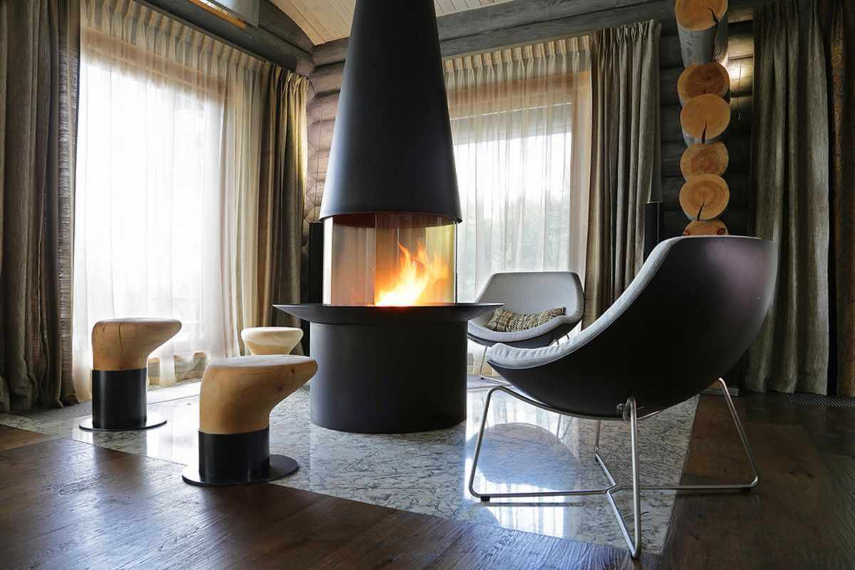 In het huisje wordt de hal vaak gecombineerd met de eetkamer, terwijl de tafel in het erkergebied of bij de ramen kan worden geplaatst. Als er een open haard in de kamer is, dan is dit vaak het centrum van het recreatiegebied. Tegenover hem plaatsen ze fauteuils of een bank, een salontafel zodat u comfortabel gasten kunt ontvangen, comfortabel zittend voor een levend vuur.