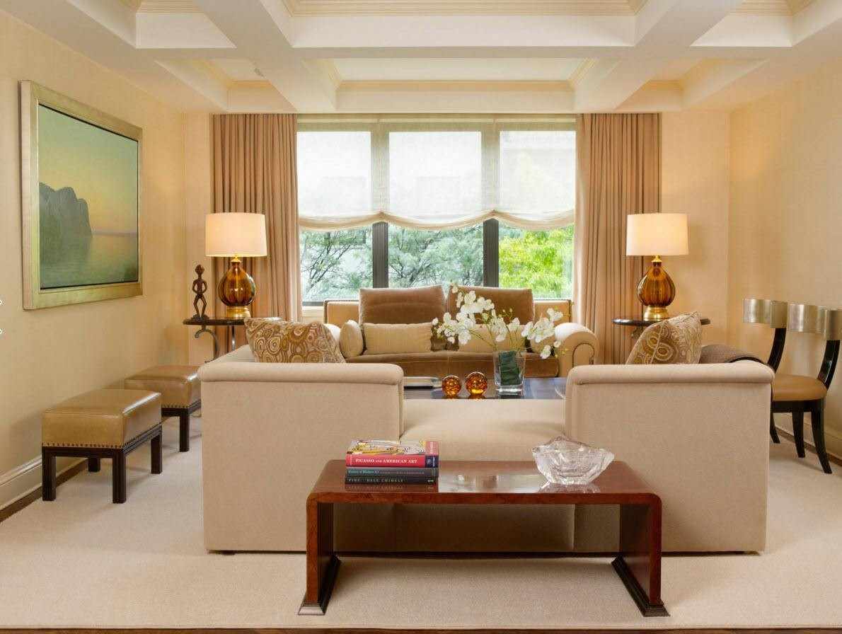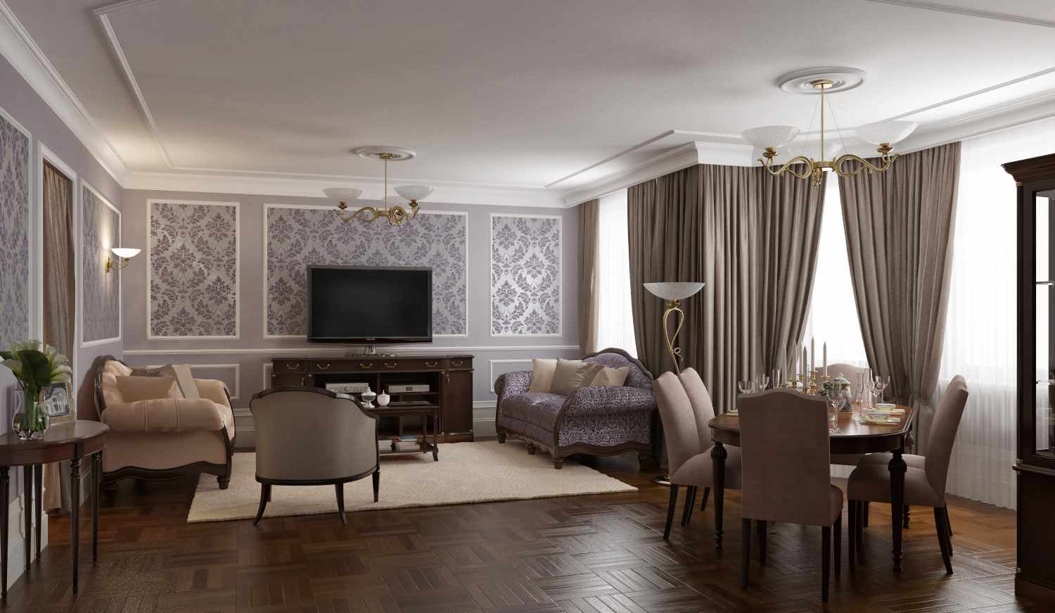 De klassiekers in het interieur zijn elegant ontworpen meubels, warme, nobele kleuren, natuurlijke materialen voor decoratie, decor en accessoires met een geschiedenis. Voor klassieke zalen zijn gordijnen met een lambrequin, een open haard, stoelen met hoge rugleuning, bewerkte houten kasten en vitrines geschikt.
