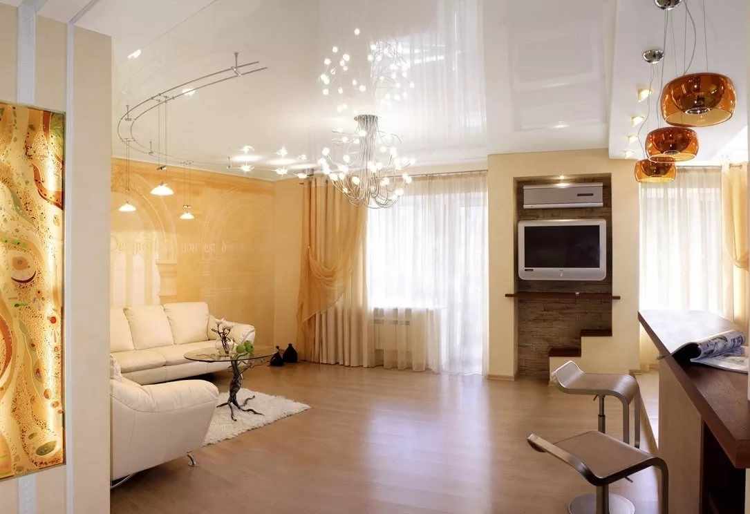 Omdat de woonkamer de meest elegante kamer is, moet het plafond ook geschikt zijn. Tegenwoordig zijn hangende, elastische, kunststof plafonds met verlichting en een unieke textuur erg populair. Klassieke versies met stucwerk zijn populair voor landelijke en klassieke interieurs, terwijl u opnieuw het kroonluchtergebied kunt markeren met stucwerk.
