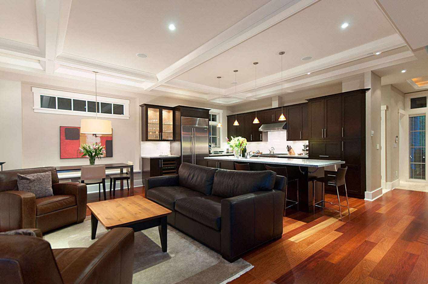 Tegenwoordig zijn er veel manieren om een woonkamer gezellig en stijlvol te maken. Vaak worden de opties om de hal en de keuken te combineren optimaal, omdat er een plek is voor een eetkamer. Bekijk foto's van een stijlvol ontwerp van zalen van appartementen en huisjes in de selectie om interessante ideeën voor uw eigen interieur te gebruiken.