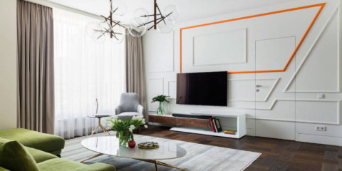Woonkamerontwerp in heldere kleuren en eigentijdse stijl.