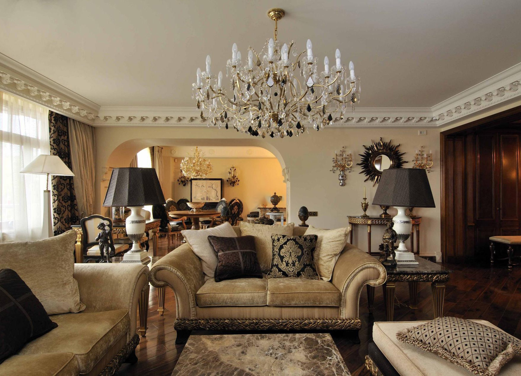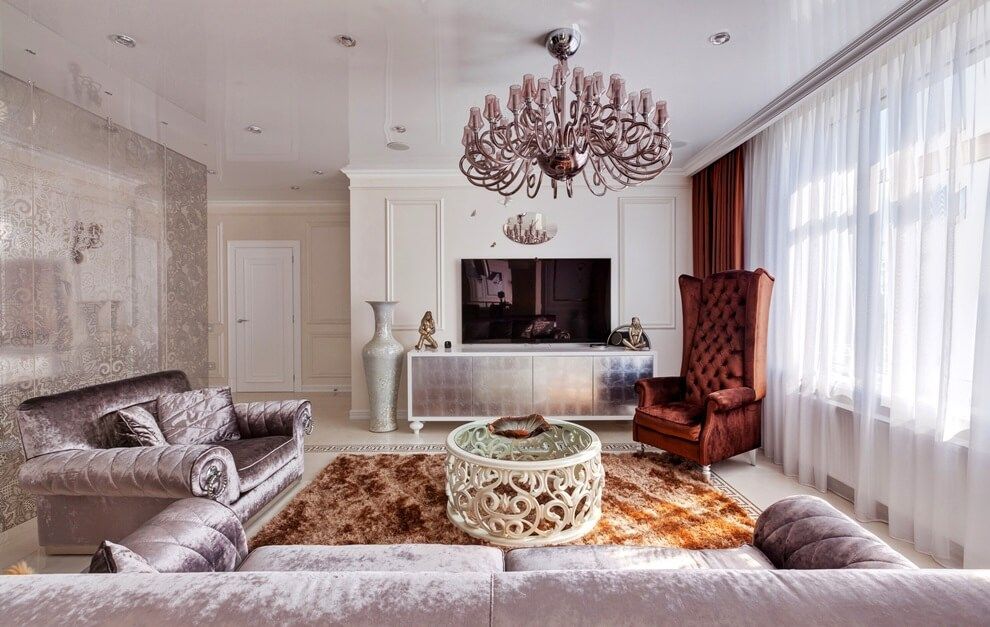 - Het gebied van de kamer. Meestal heeft een woonkamer een groot formaat. Om een voldoende verlichtingsniveau te creëren, is een plafondlamp met verschillende tinten (drie of meer) gekocht. De grootte van de kroonluchter is verdeeld in small, medium en large. Voor een kleine woonkamer (minder dan 18 m²) is het ongewenst om omvangrijke lichtbronnen te kopen. De beste optie is tot 30-50 cm in diameter. Voor een hal met een oppervlakte van meer dan 30 vierkante meter. m geschikte grootte vanaf 100 cm in diameter. De meest populaire kroonluchters zijn middelgroot, van 50 tot 70 cm.