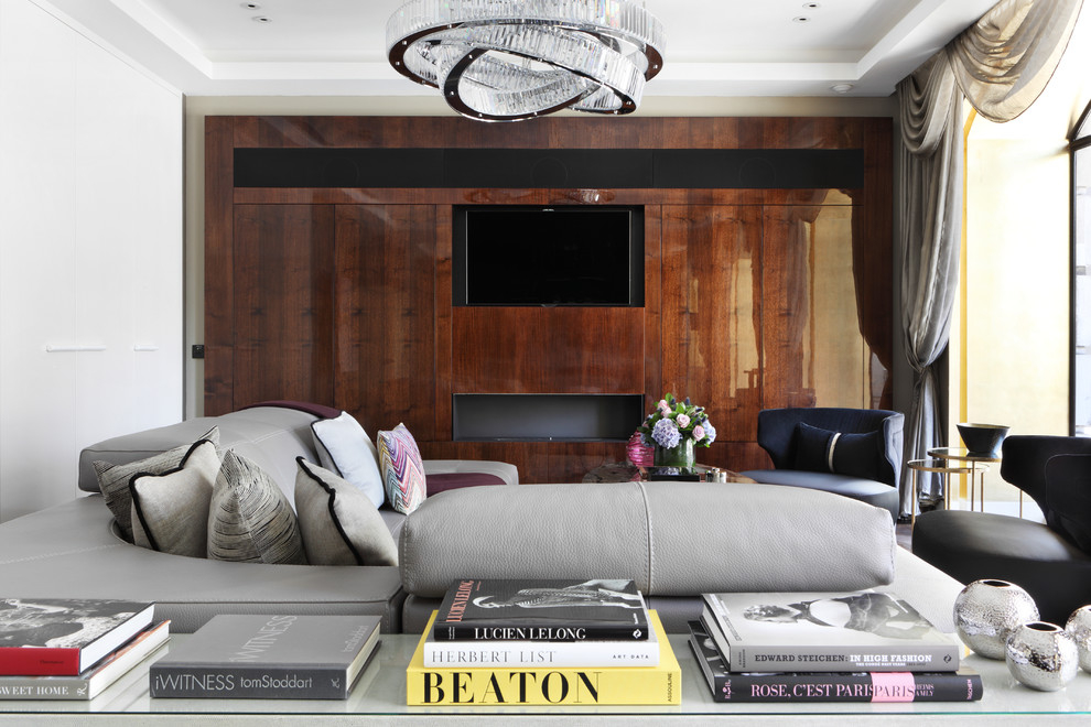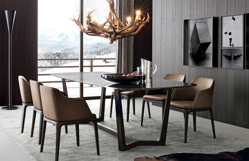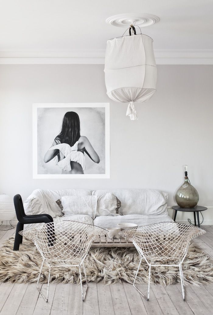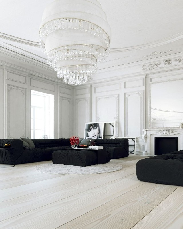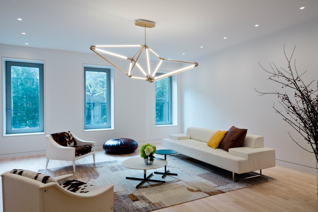 Een typische oplossing voor een minimalistisch interieur is een overhead kroonluchter aangevuld met ingebouwde spots