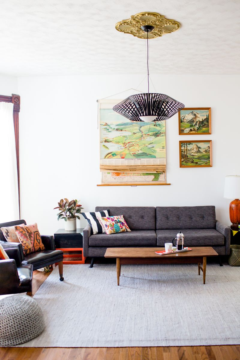 - plafond kroonluchter in de vorm van een omgekeerde plaat (de vorm verspreidt met succes het licht door de kamer en bespaart ruimte).