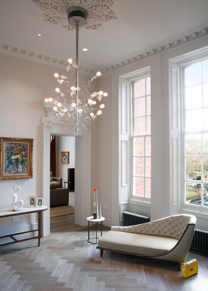 Plank kroonluchter met kleurrijke tinten zal een centrale plaats innemen in het interieur van de hal met witte bekleding