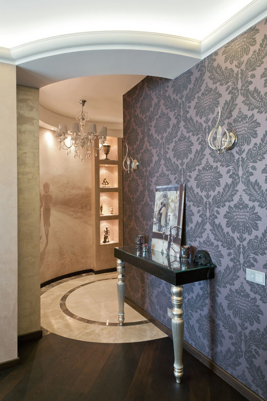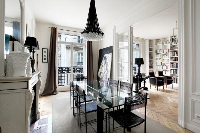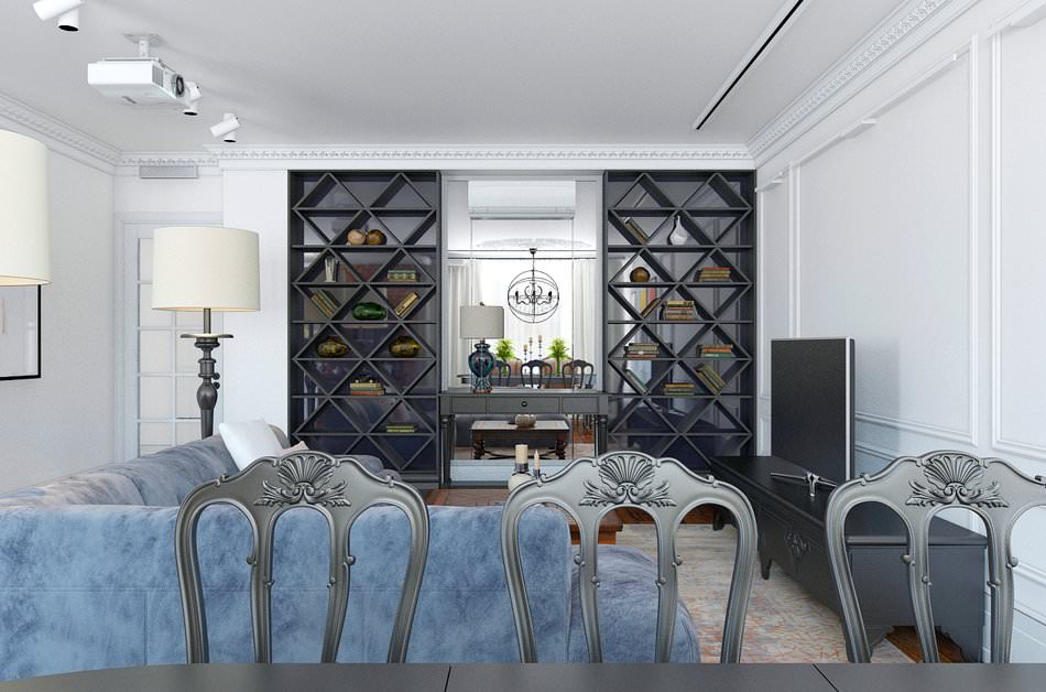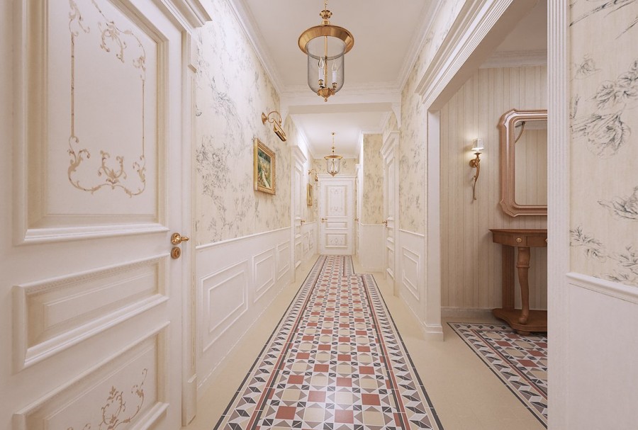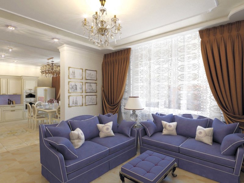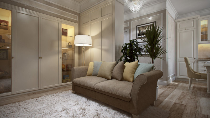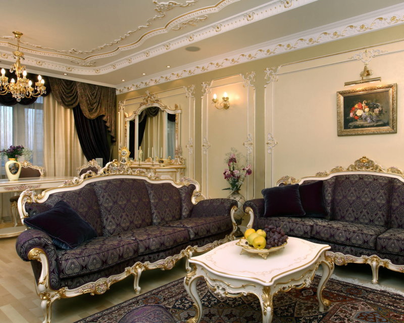 - Classic. In de klassieke stijl zijn grote appartementen het vaakst ingericht. Hij wordt gekenmerkt door de meest correcte symmetrie, luxueuze afwerkingsmaterialen. Gordijnen en achtergronden tonen monogrammen, ingewikkelde florale ornamenten. Het interieur wordt aangevuld met een open haard in het midden van de muur, verschillende schilderijen in houten gesneden frames.