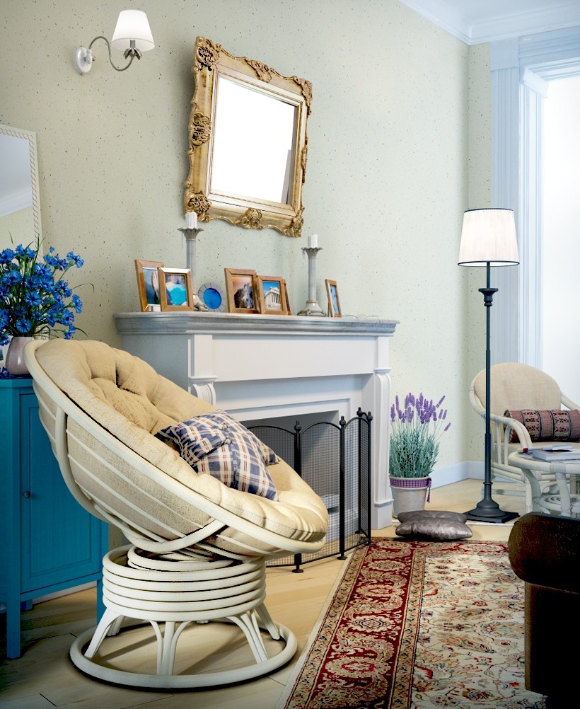 - Provence. Gezellige "rustieke" stijl is warme tinten, licht versleten meubels die oud, dun imiteren, alsof ze in de zon vervaagd zijn, gordijnen in een kleine bloem. Rieten manden, droge boeketten, gesneden overhead-elementen op meubels worden hier als decor gebruikt.