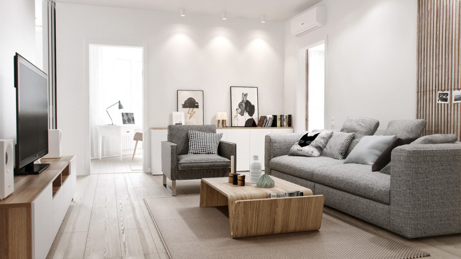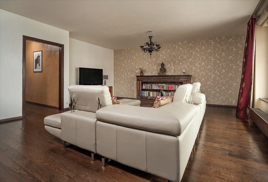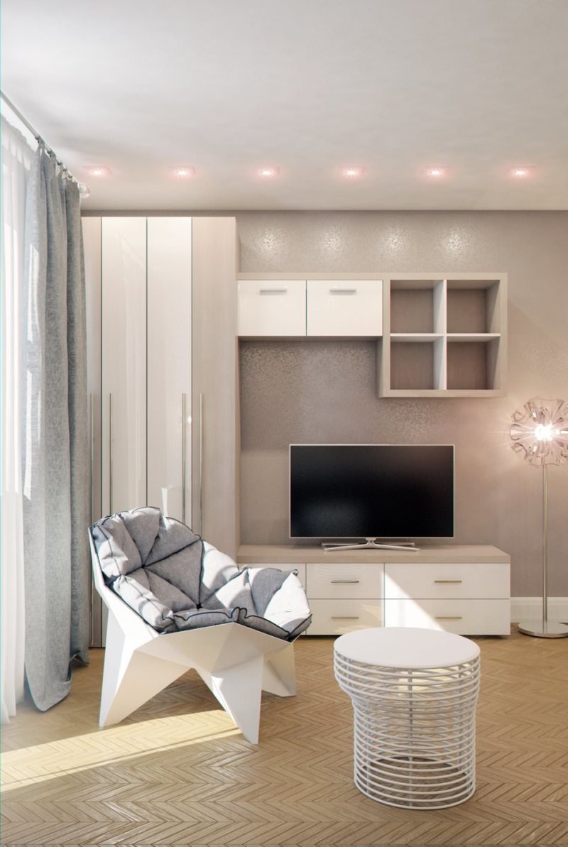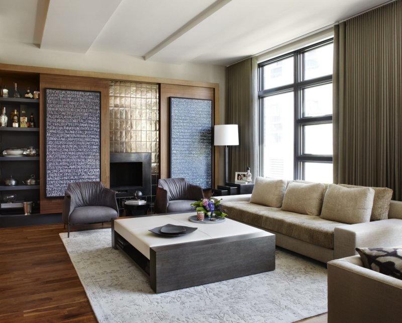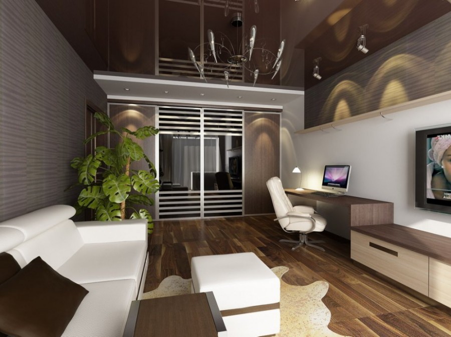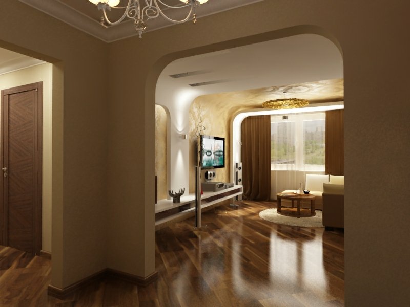 - Woonkamer Als hal wordt meestal de grootste kamer in het appartement gebruikt. De centrale plaats hier wordt ingenomen door een comfortabele bank, een groot televisiescherm, een tafel met verstelbare hoogte, grootte.