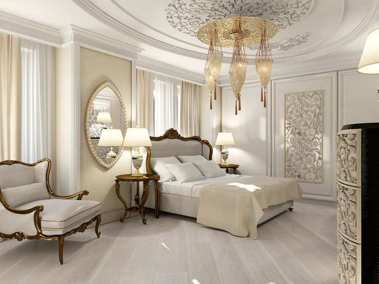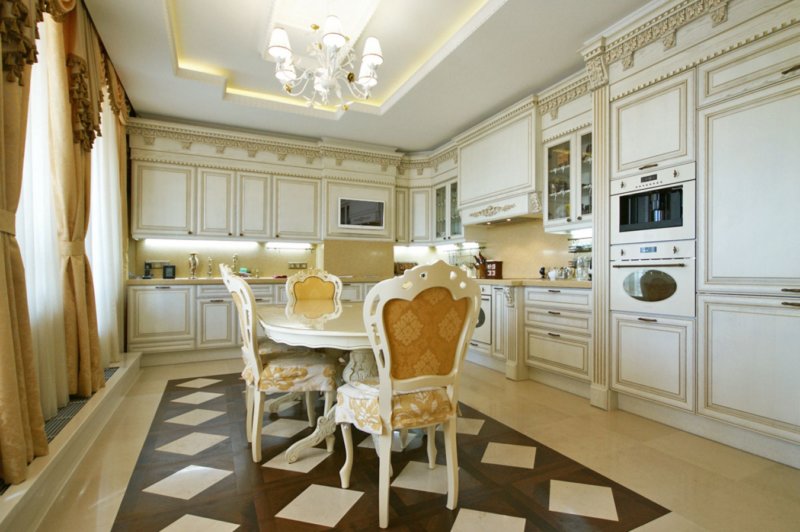 - Rijk. Het "paleis" -ontwerp omvat vloeren en plafonds met patronen, een overvloed aan stucwerk, vergulding, oude schilderijen, decor in de vorm van lauwerkransen, schilden, zwaarden. Materialen - waardevolle houtsoorten, natuursteen, brons, luxueuze stoffen.