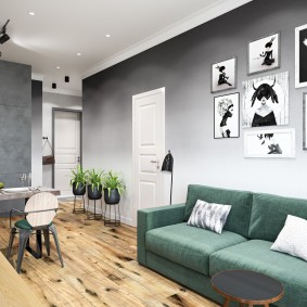 Een van de meest voorkomende soorten studio's. Per oppervlakte is een dergelijke studio vergelijkbaar met een tweekamerappartement. Zonering van deze ruimte wordt voorgesteld door schermen en schuifelementen, die zowel transparant als matglas kunnen zijn. En monochrome muren met heldere accenten zullen het gebied uitbreiden.
