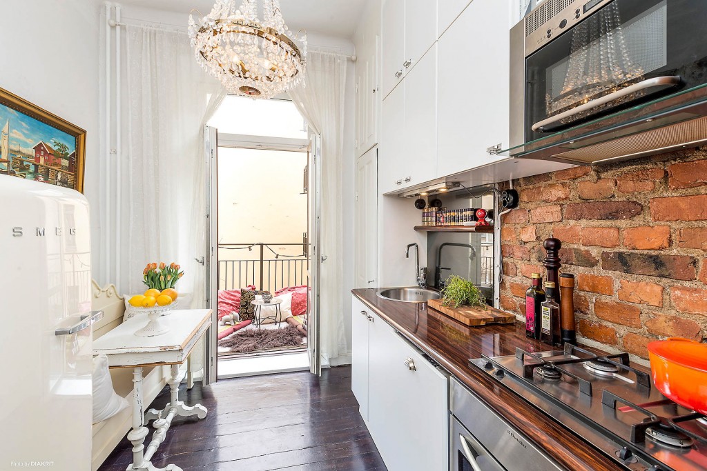 - Table. De toog kan de eettafel vervangen, ook kunt u voor deze doeleinden een kleine klaptafel kopen, die ook als element van het interieur kan worden gebruikt.