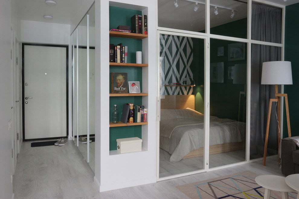- Bij het ontwerpen van verschillende kamers van de studio moet aandacht worden besteed aan hun kenmerken: afzuigkap voor de keuken, zonering voor de slaapkamer, blinde deur voor de badkamer.