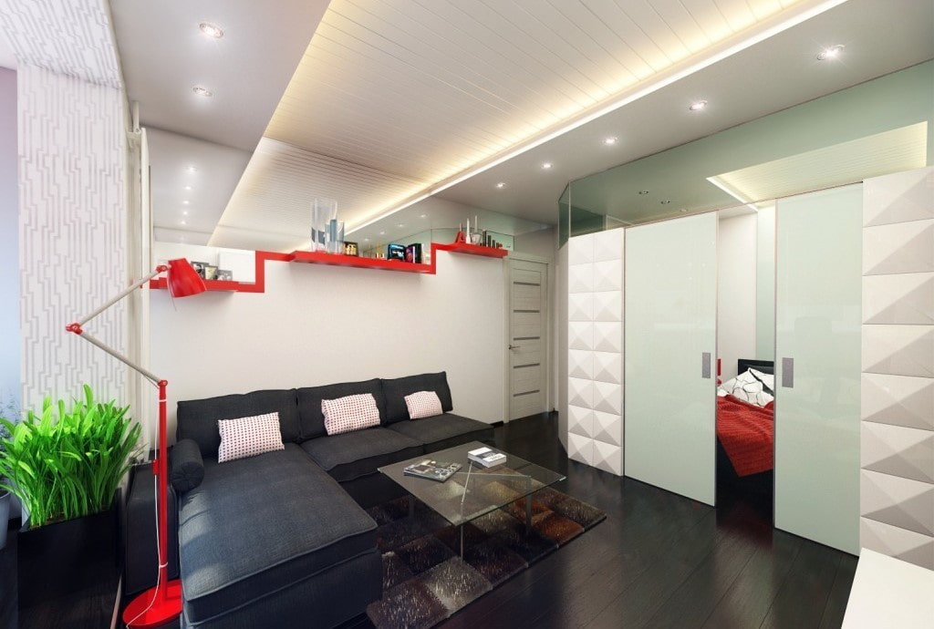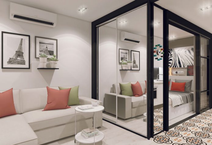 - Juiste zonering: er moet een scheidingswand zijn in het slaapgedeelte. Als u de ruimte tussen de woonkamer en de keuken alleen voorwaardelijk kunt onderscheiden, moet u kiezen voor schuifdeuren of schermen naar de slaapkamer.