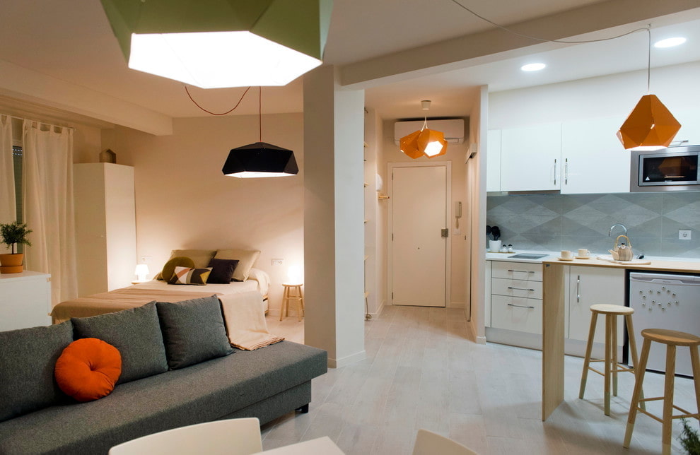 - Lichtzonering: hanglampen, tafellampen, lantaarns - elementen die kunnen worden gebruikt om de slaapkamer van de woonkamer te scheiden, met behulp van zwak licht in het slaapgedeelte en helderder in de woonkamer.
