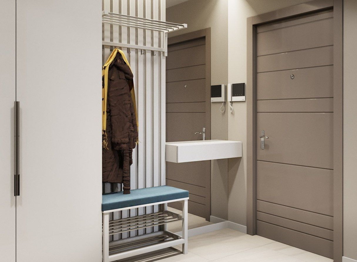 De hal in studio-appartementen is meestal klein. Inbouwmeubels, een hanger met haken en een schoenenrek zijn hier geschikt.