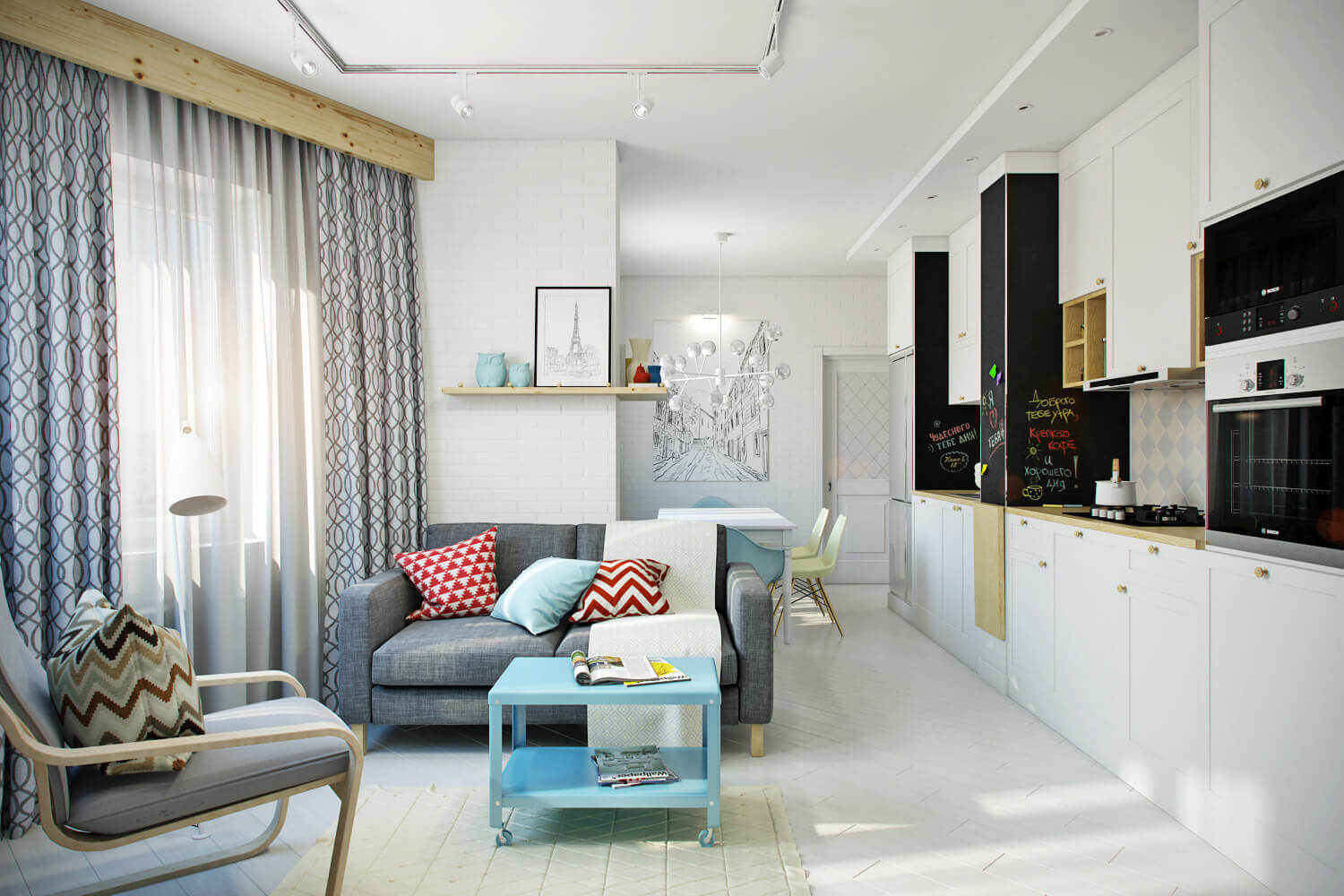 - vakkundige zonering: het is noodzakelijk om de woonkamer van de keuken te scheiden, zonder de ruimte te overladen met massieve scheidingswanden;