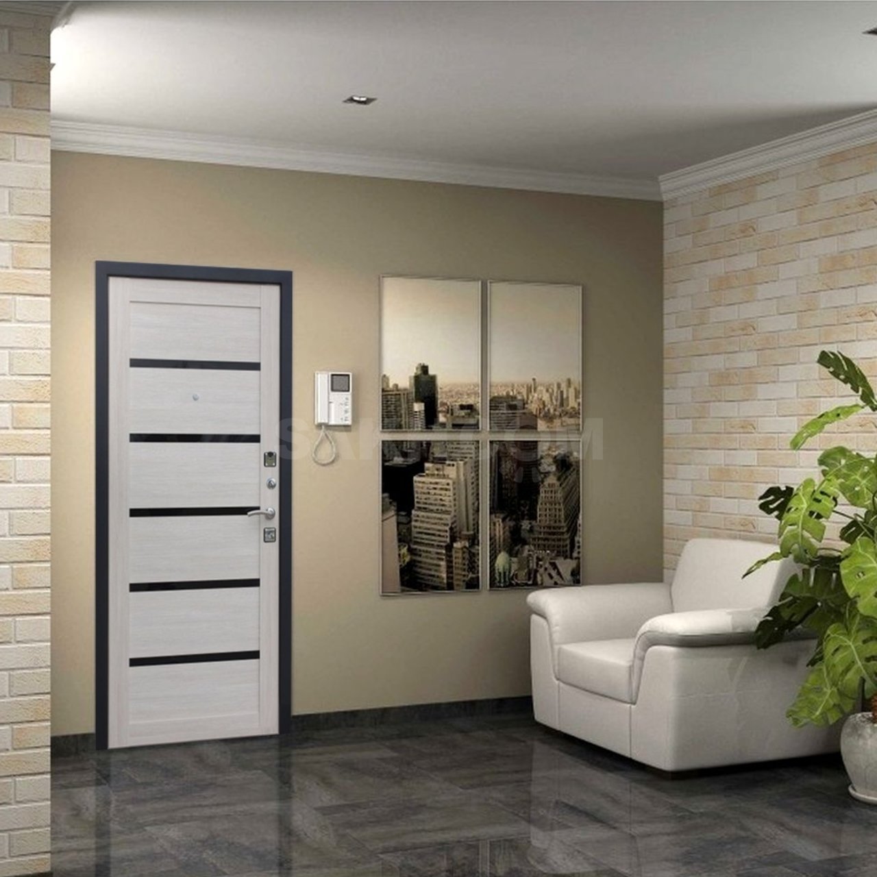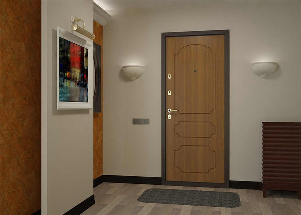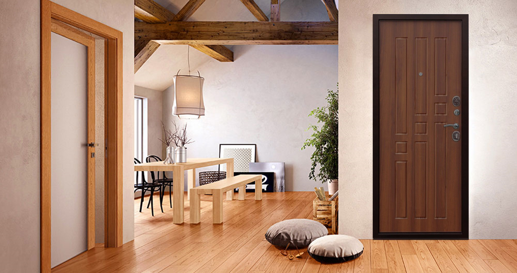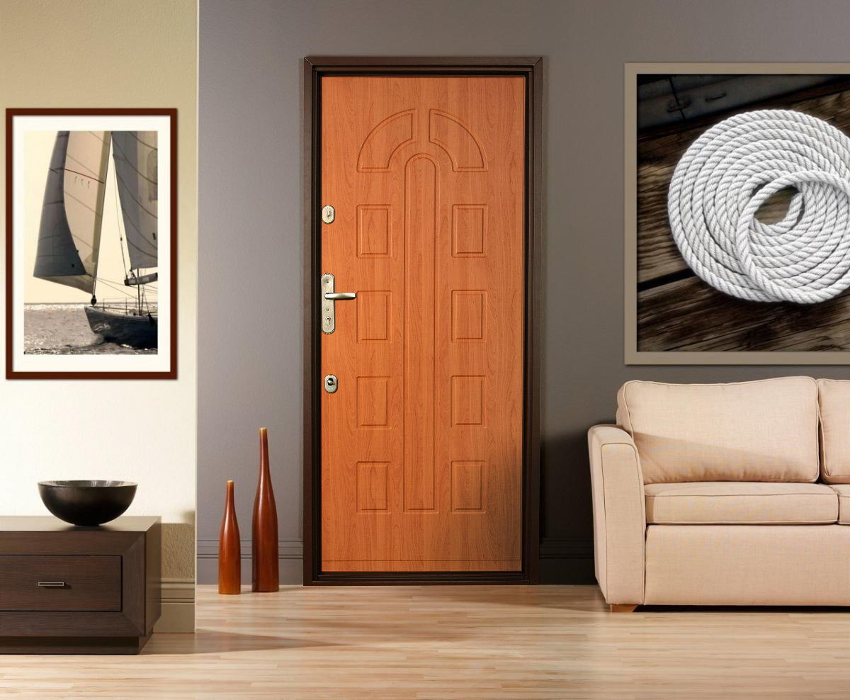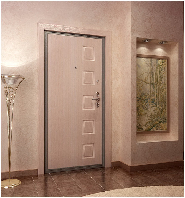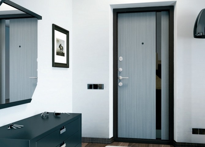 Een goede optie voor diegenen die om het stilistische component geven. Qua uiterlijk ziet de deur er mooi en eenvoudig uit, maar ondoordringbaar staal is verborgen onder de eerste laag hout en textuur. Het belangrijkste is dat de keuze enorm is en dat u uw eigen optie kunt vinden.