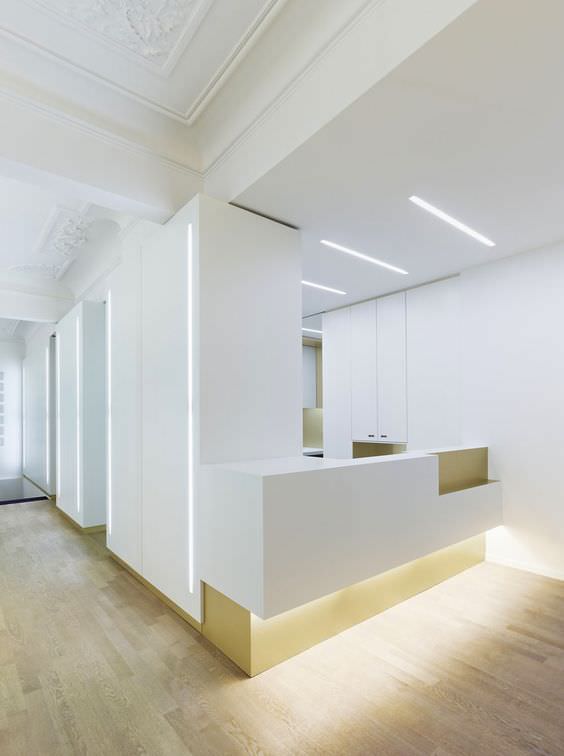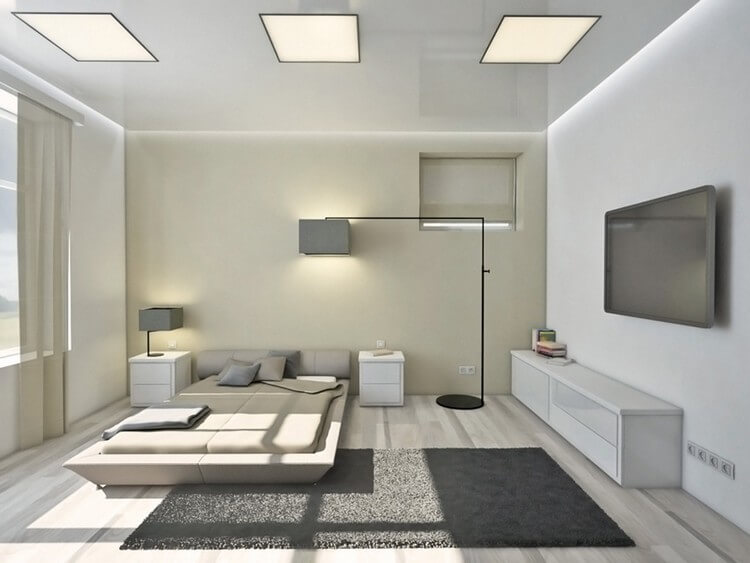 - Het interieur moet ruim zijn en gevuld met licht - grote ramen en een overvloed aan allerlei lichtbronnen die in alle delen van de kamer kunnen worden geplaatst: plafond, muren, vloer, zelfs meubelverlichting zijn welkom.
