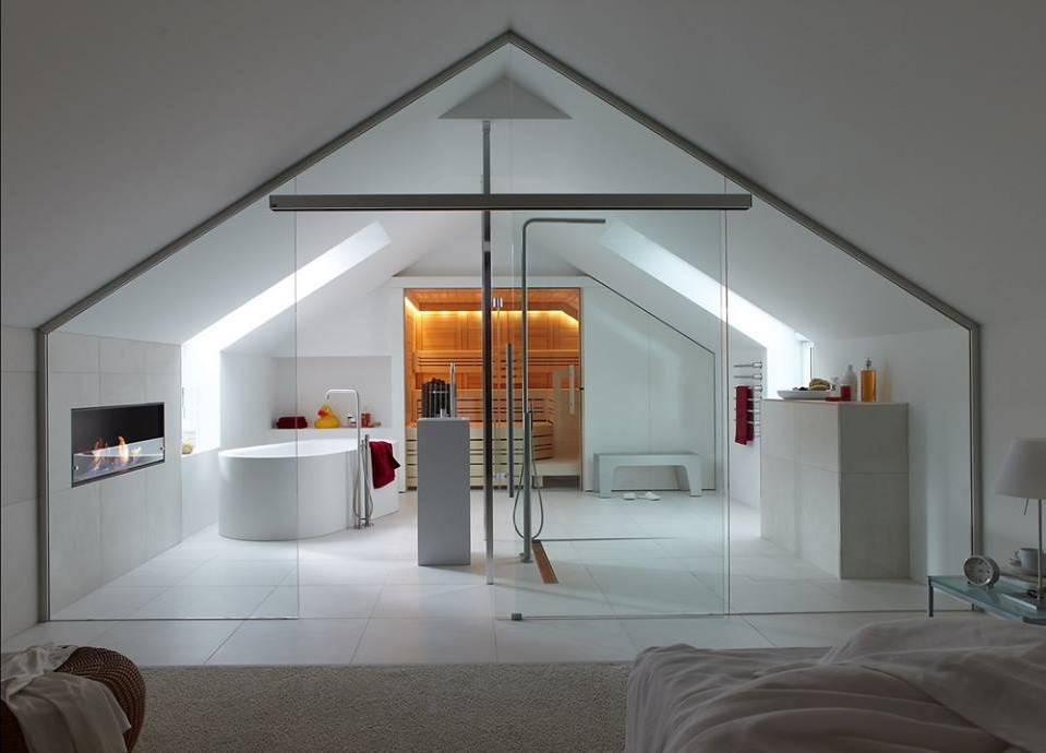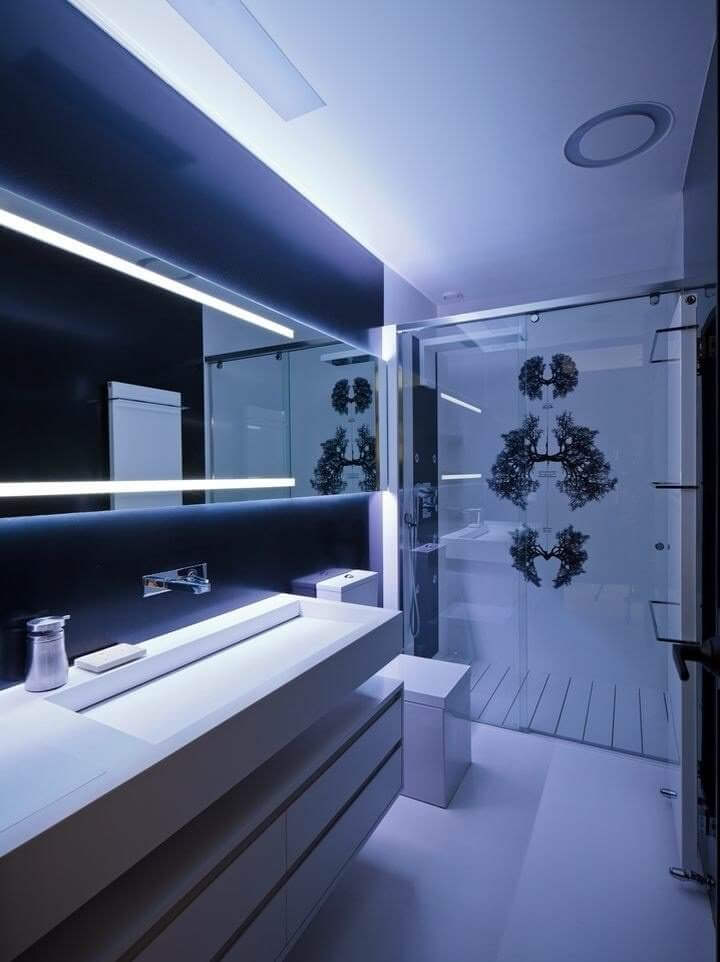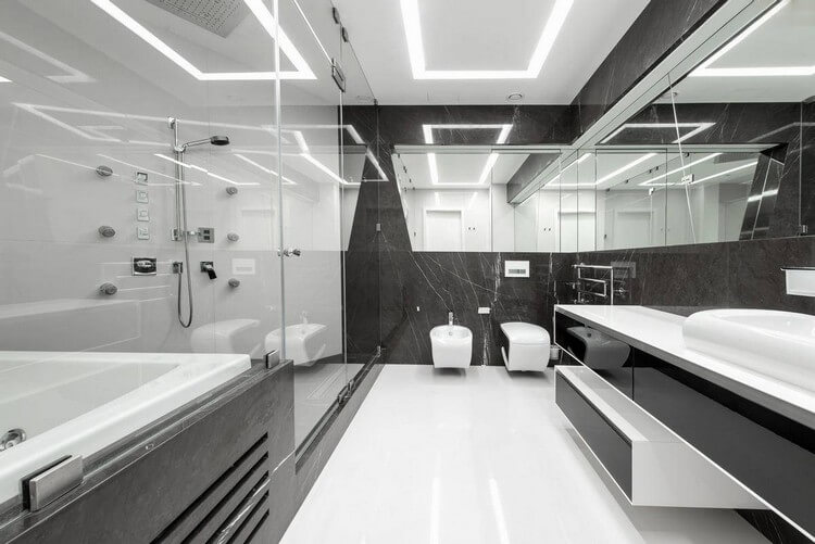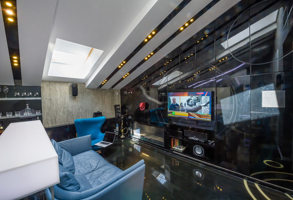 Het interieur wordt aangevuld met hightech verchroomde kranen, spiegels, glazen douchedeuren en de originele verlichting van sommige details, ongebruikelijke verlichtingsarmaturen.