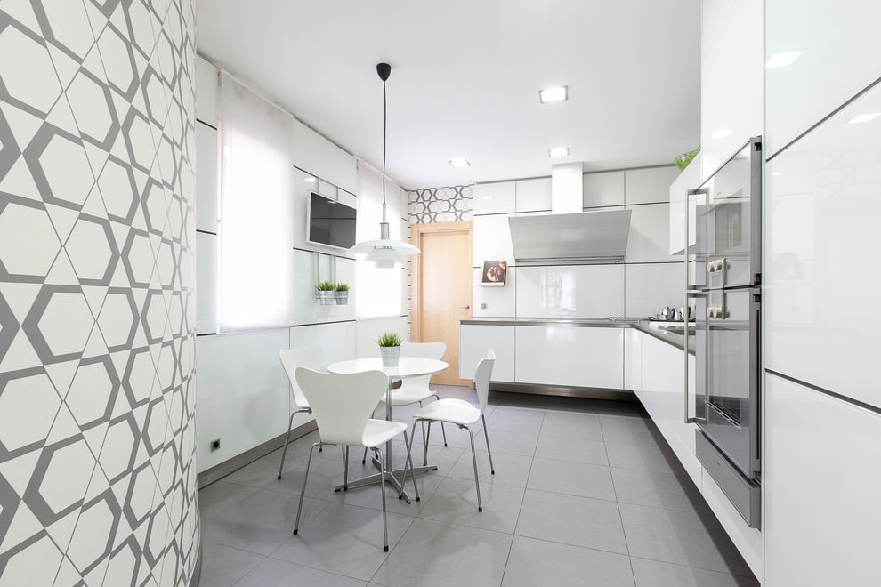 Het hi-tech kleurenpalet is gebaseerd op ingetogen tonen - wit, zwart en grijs. Andere kleuren kunnen worden geaccentueerd.