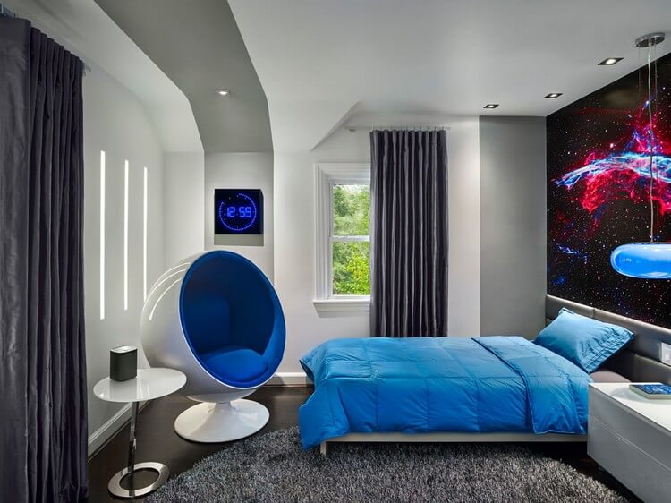 In dergelijke kleuren zijn de kamers van tienerjongens vaak versierd. Ze worden perfect aangevuld met chromen details en hoogglanzende glanzende oppervlakken.