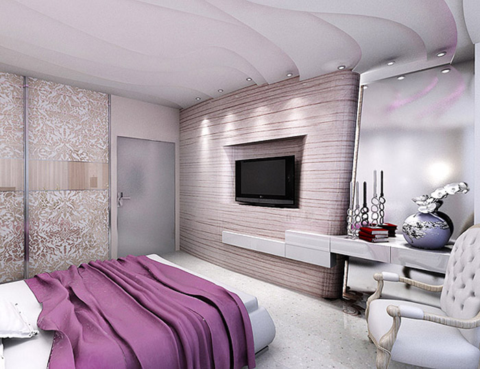 Een uitstekende lichte toevoeging aan zowel de slaapkamer als de woonkamer kan textiel zijn: tapijten, kussens, gordijnen. Het hoogtepunt en het accent worden een elektrische open haard.