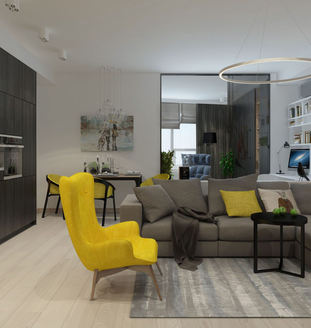 Verschillende grijstinten werken perfect samen met gele huisdecoratie. Een uitstekende ontwerpbeslissing is om het interieur van de woonkamer te creëren, ingericht in grijze tinten, met een helder accent in de vorm van lederen fauteuils.