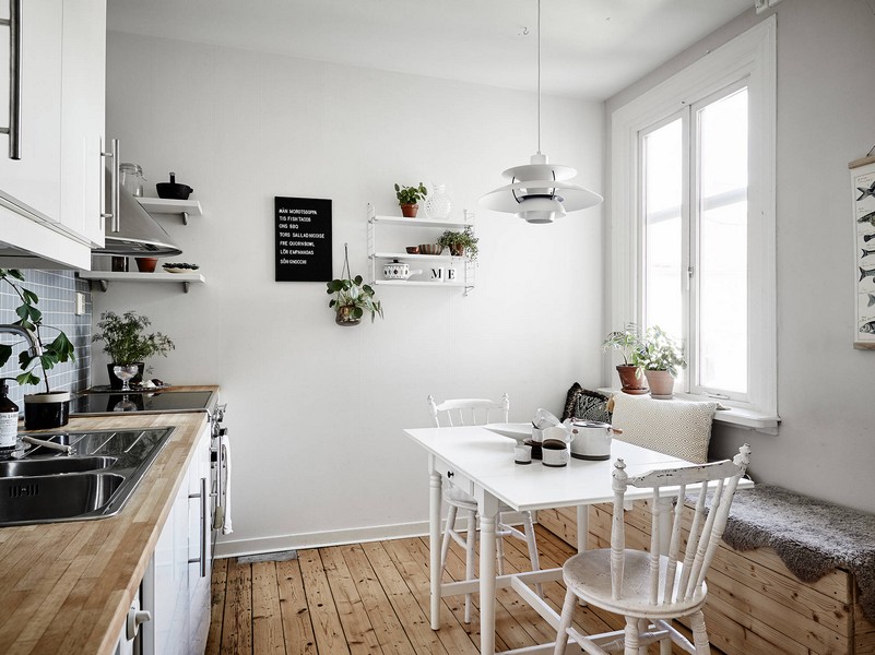 Lichte keuken in Scandinavische stijl met een kleine bank bij het raam