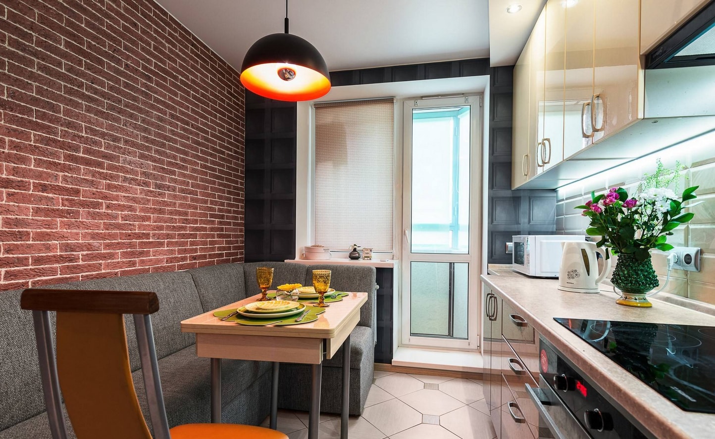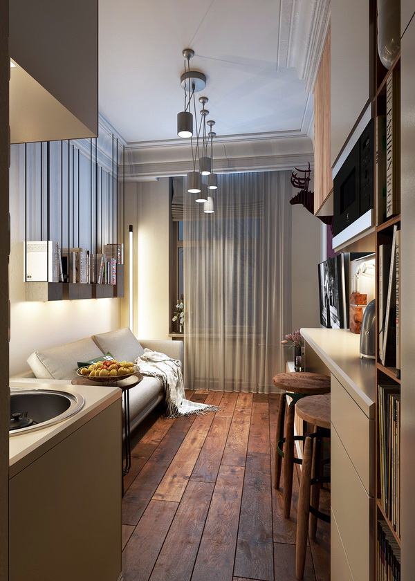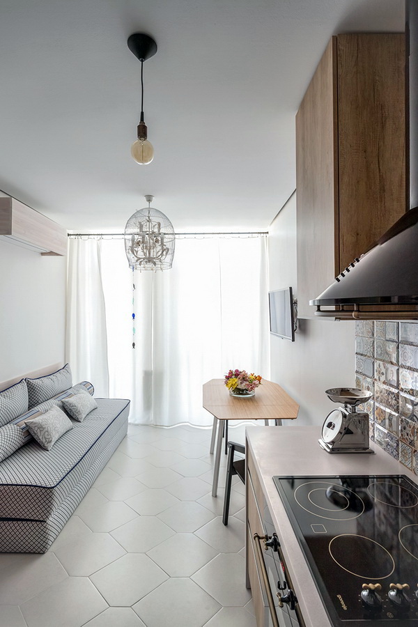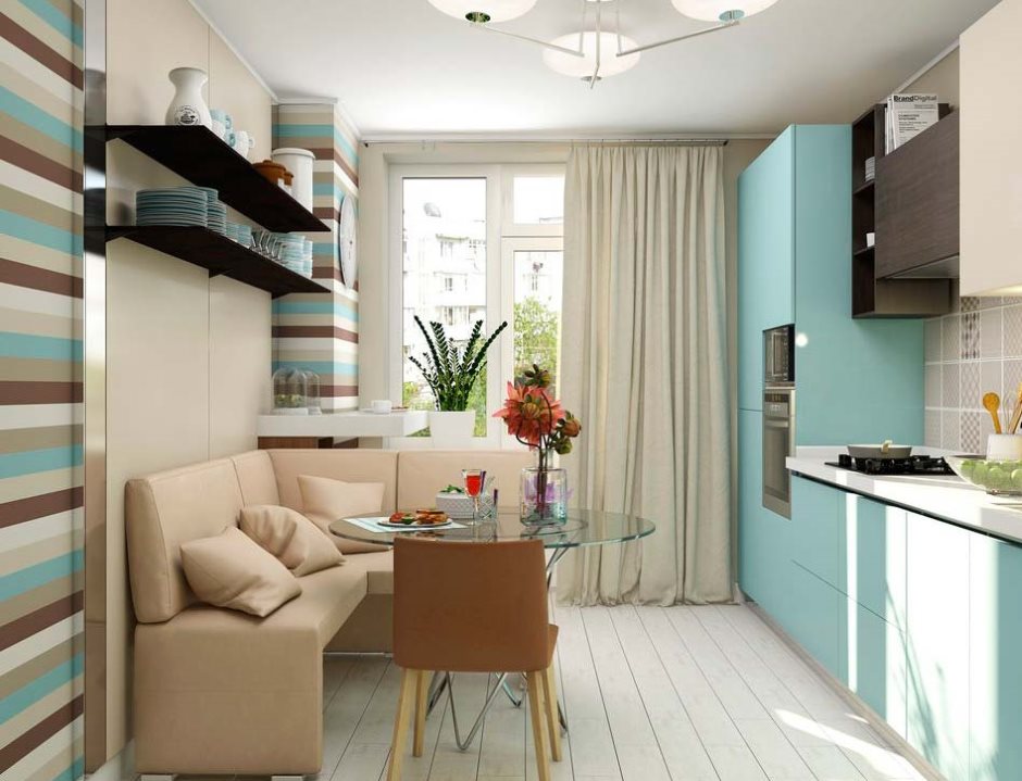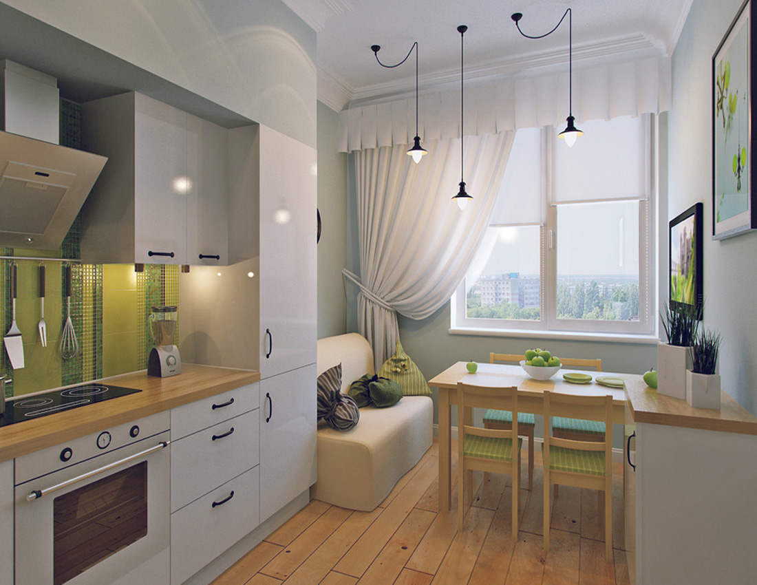 De bank kan dienen als een licht accent van het interieur van een kleine keuken-woonkamer