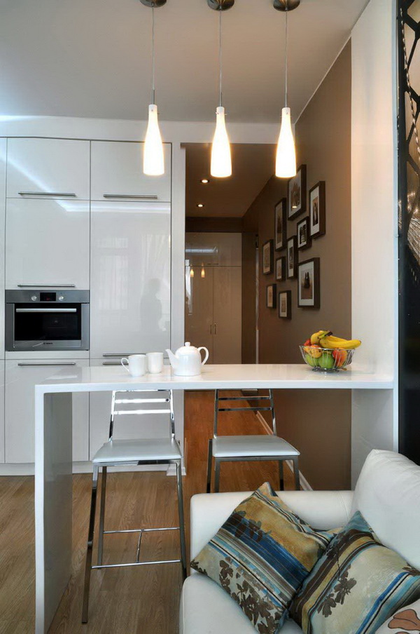 Om het werkgebied van de eetkamer te scheiden, kunt u de bar gebruiken en deze in de vorm van een schiereiland plaatsen
