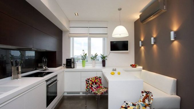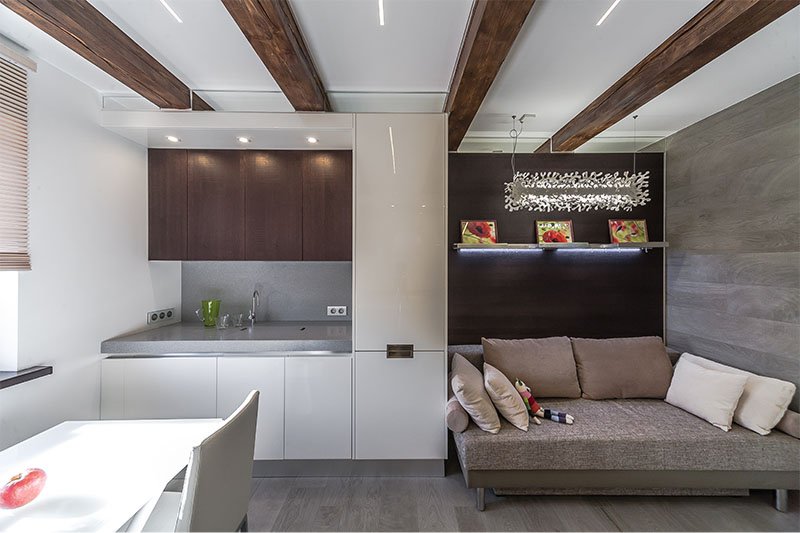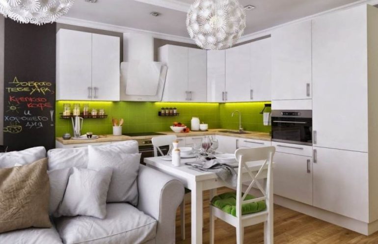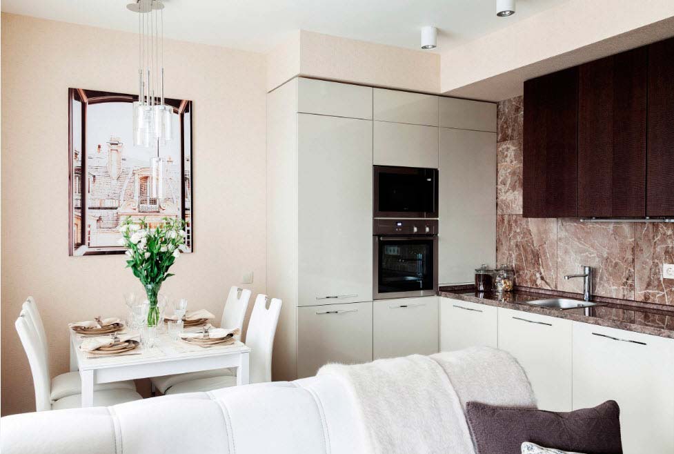 - Foto-ideeën voor het ontwerp van een compacte keuken-woonkamer