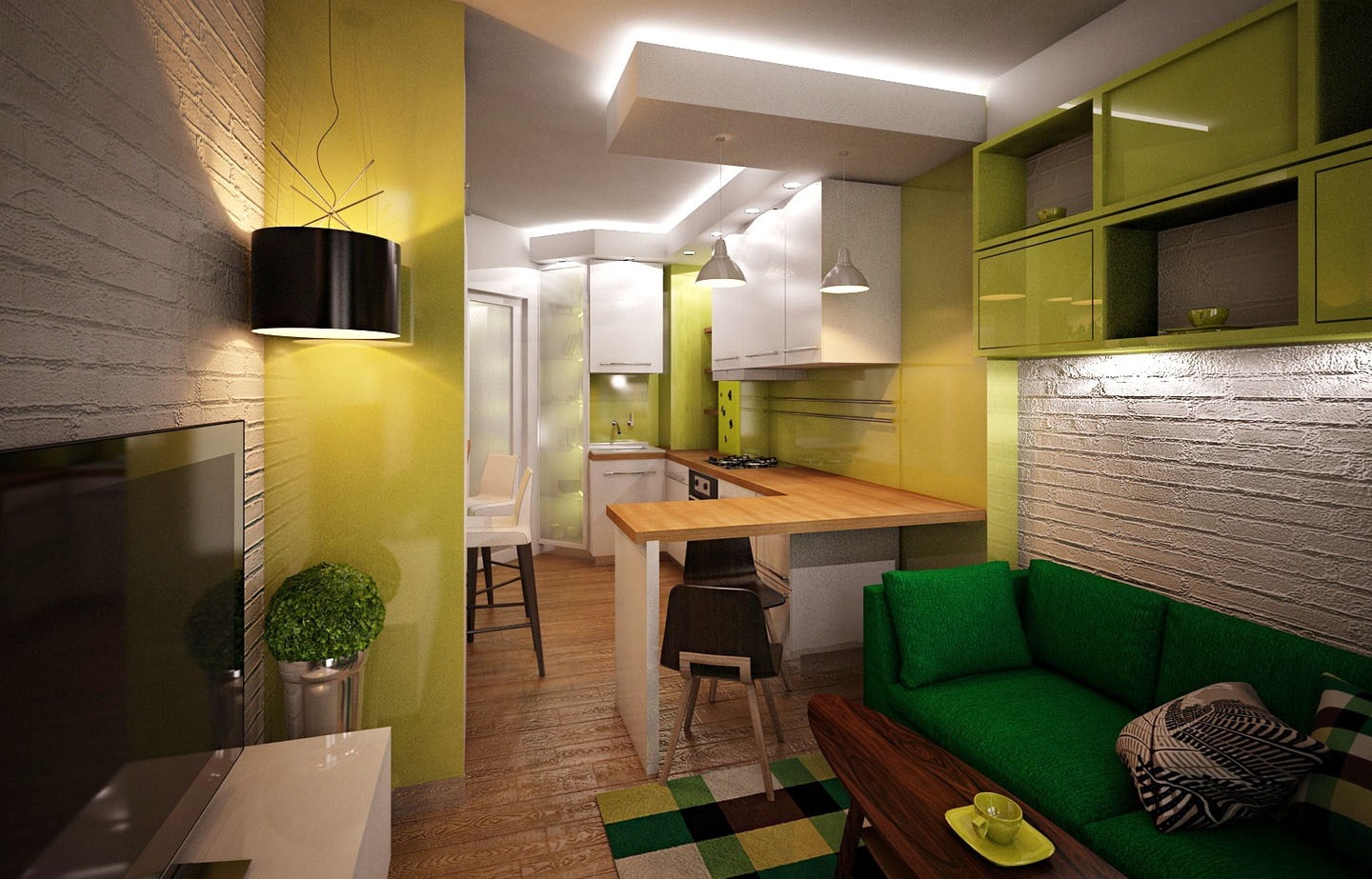 Bij het repareren van een keuken-woonkamer rijzen altijd vragen over hoe meubels beter kunnen worden gerangschikt, een kleurenschema en stijl van een kamer kiezen.