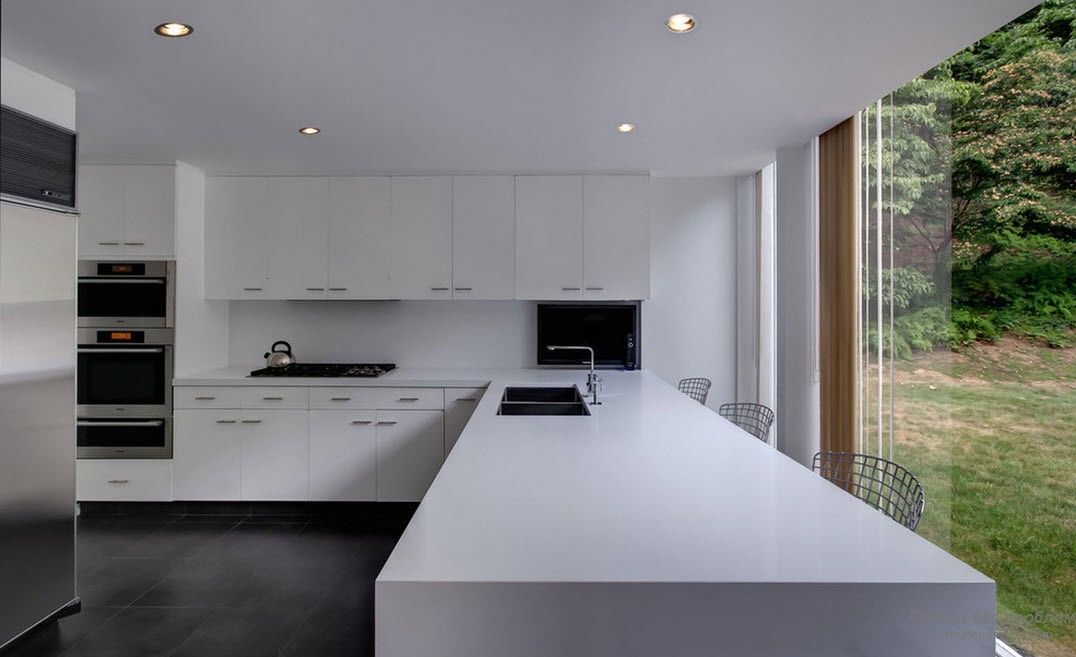 - U-vormig is vooral geschikt voor een grote kamer, en in de tweede is het ideaal voor een groot gezin, waar u vaak veel moet koken. De bijzonderheid is dat naast de belangrijkste functionele gebieden ook een groter aantal werkoppervlakken wordt geboden dan in enig ander type lay-out.