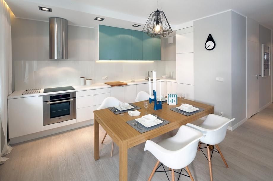 - Een lineaire manier om een keukenblok te installeren, is door het meubilair in een rij langs de muur te plaatsen. Het bijzondere van deze indeling is dat het meubilair niet veel ruimte inneemt en voldoende ruimte overlaat voor de uitrusting van de eetkamer.
