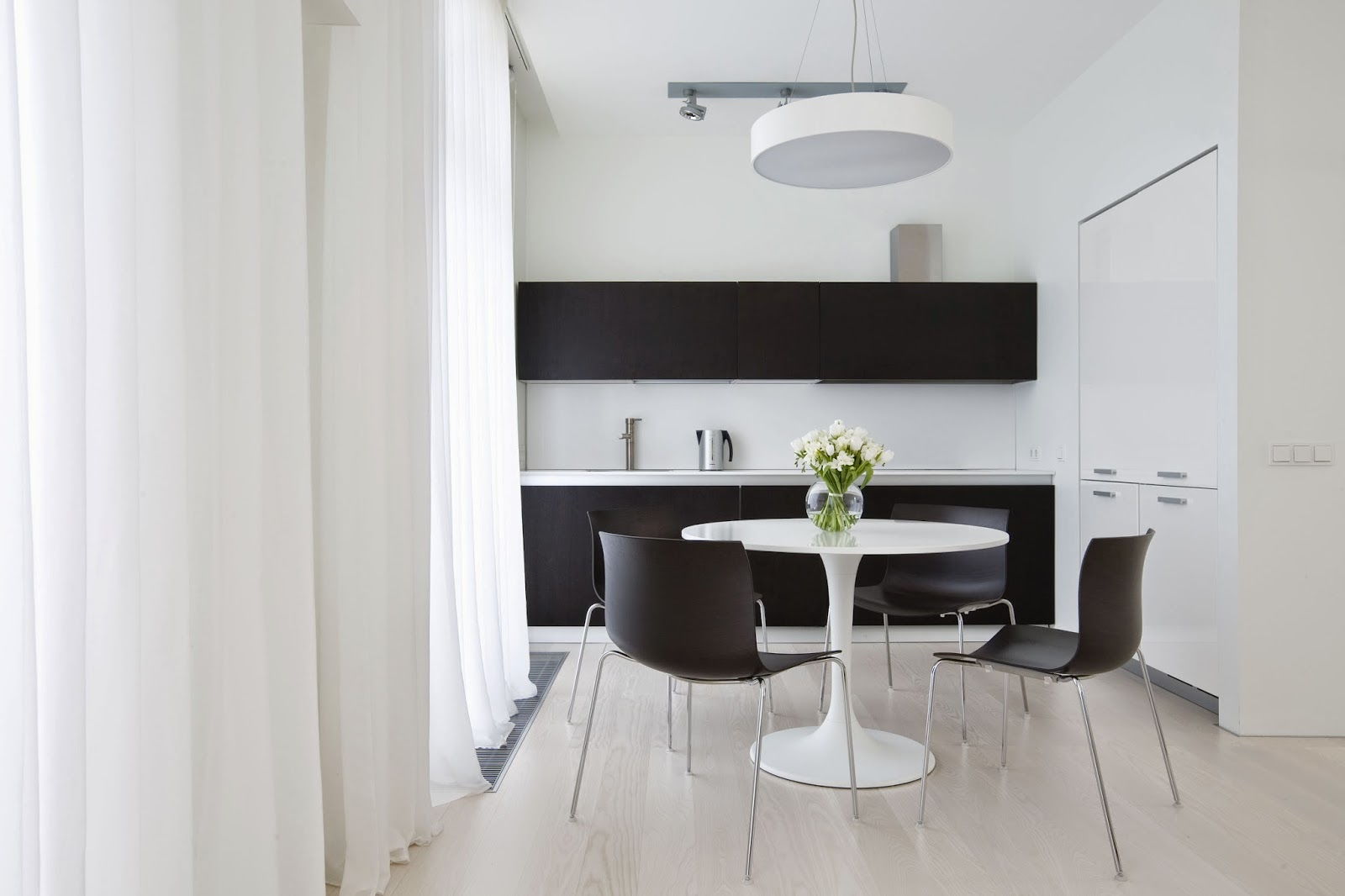Universeel wordt beschouwd als witte kleur, geschikt voor het interieur in elke stijl. In combinatie met andere tonen verbetert hun intensiteit