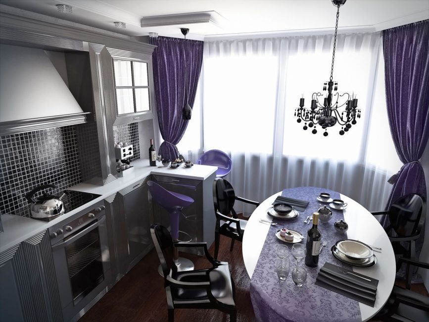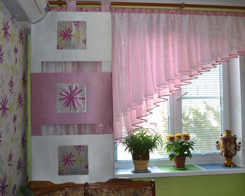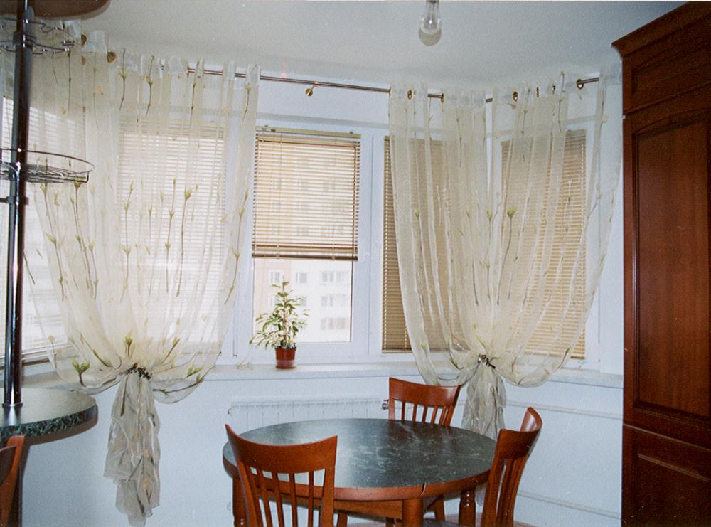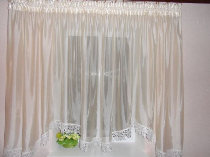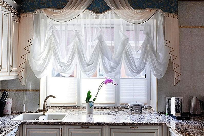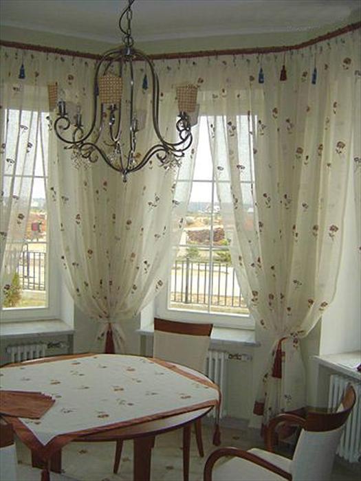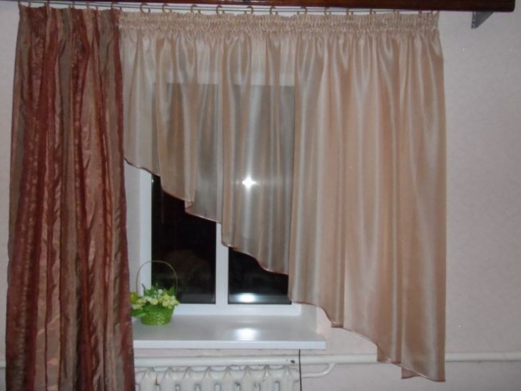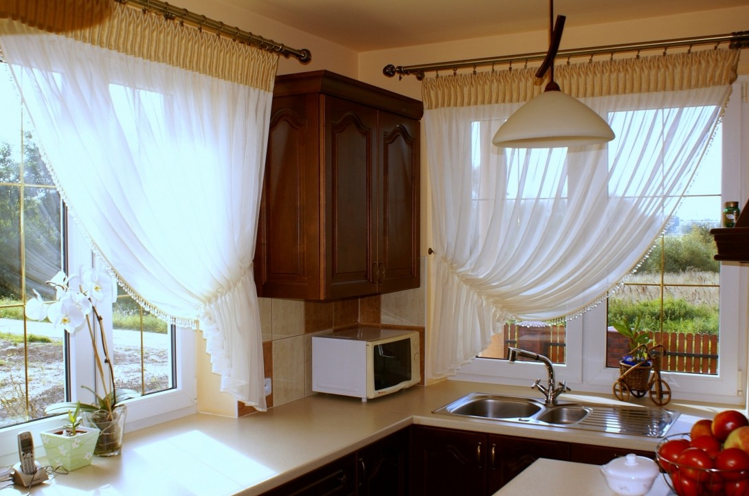 Met deze vorm van het gordijn kunt u de fouten van de raamopening verbergen of de hoekvensters versieren. Gordijnen met een dergelijke snit zijn een niet-standaardoplossing voor standaardproblemen. Ze zijn erg praktisch en laten tegelijkertijd zonlicht de kamer binnenkomen. Dit is vooral belangrijk wanneer de keuken zich aan de noordkant bevindt.
