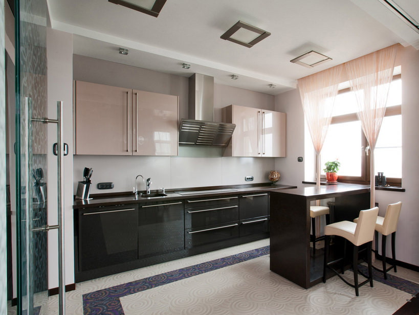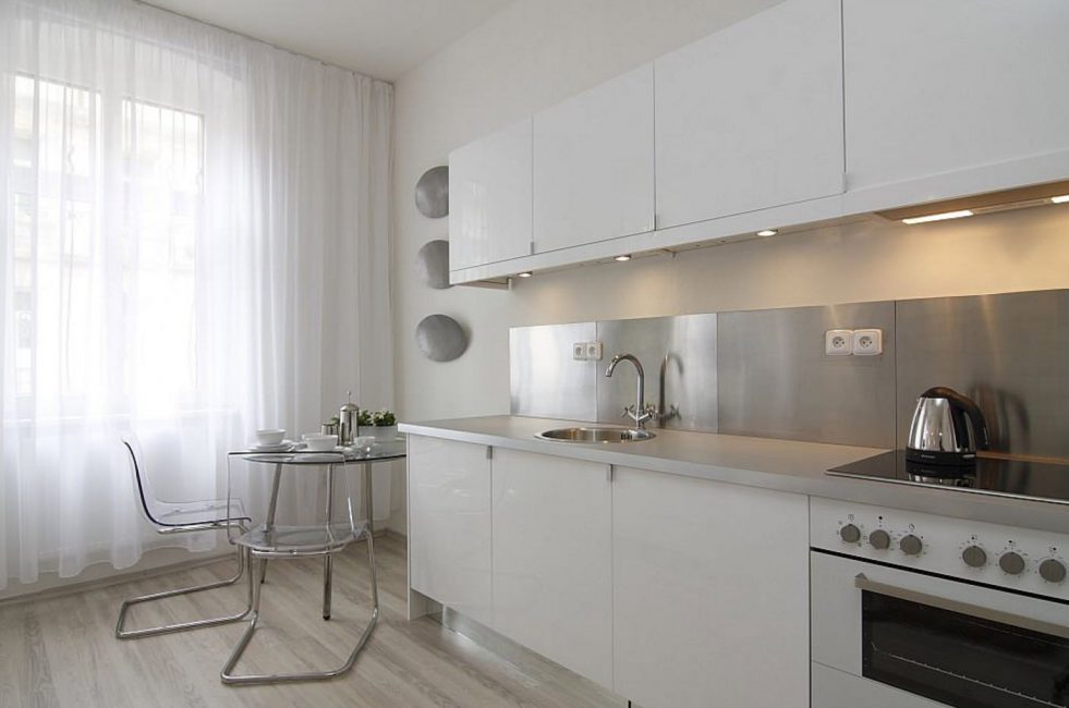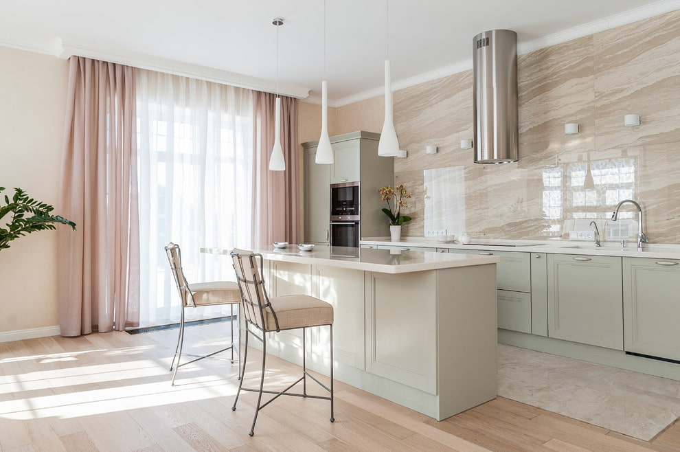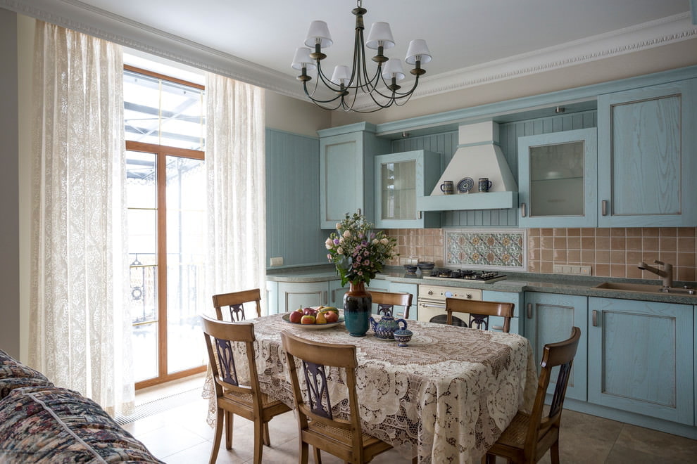 - Lichtgekleurde tule verbetert de keuken visueel en maakt het interieur luchtiger en lichter.