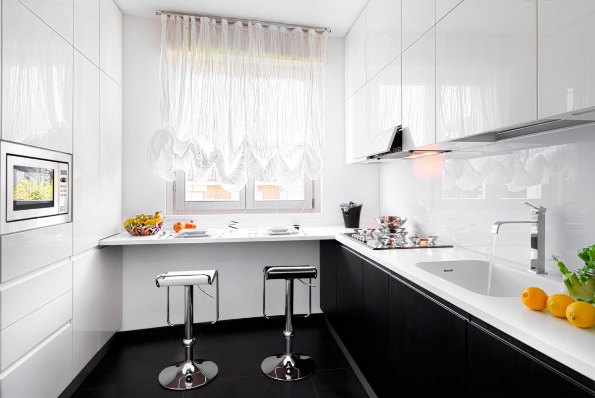 - Short. De lengte tot de vensterbank is al heel lang niet ondergeschikt aan zijn leiderschapspositie. Dit is in de eerste plaats te wijten aan het feit dat dit de meest praktische optie is: korte tulles in de moderne keuken worden minder vies en interfereren niet met bepaalde acties. Bovendien vergroot het visueel de ruimte.