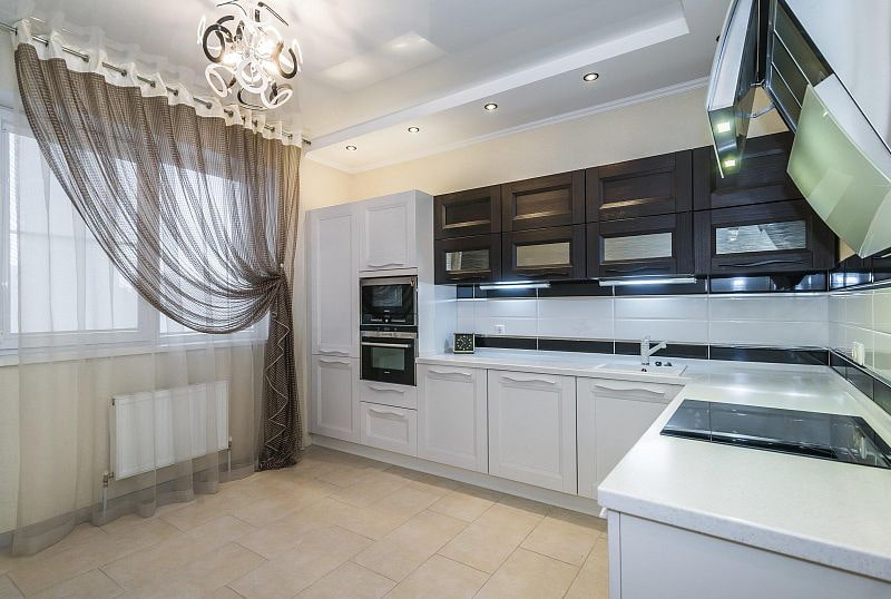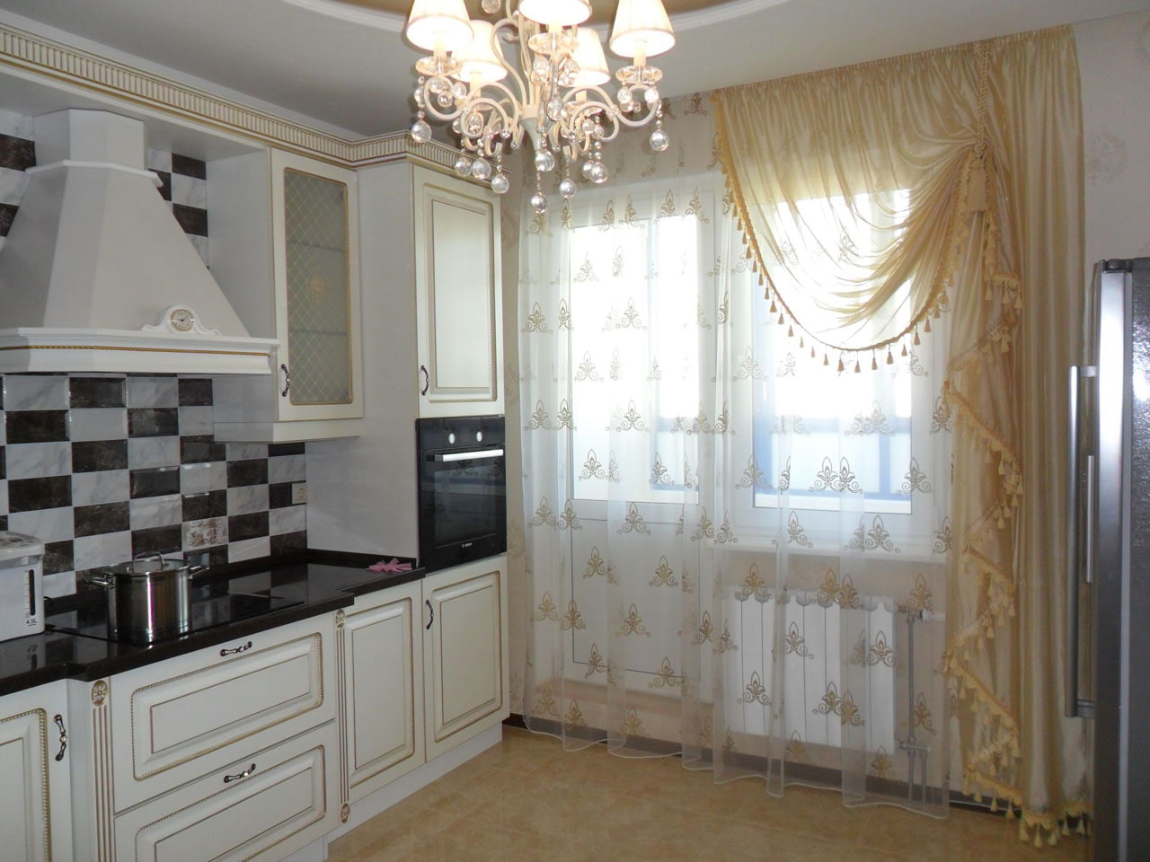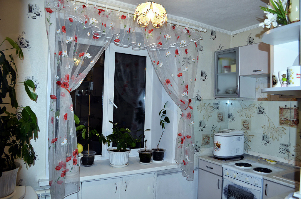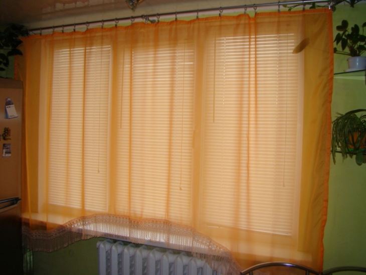 Let bij het kiezen van een tule in de keuken op de grootte van de kamer. Lange (tot de vloer) gordijnen zijn geschikt voor ruime, korte (tot de vensterbank) - voor kleine kamers.
