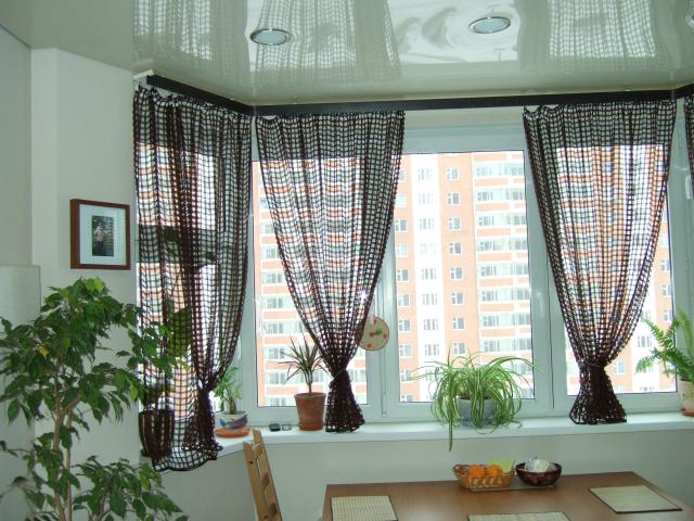 Wat betreft de vorm, de meest praktische zijn de hoek, aan twee kanten, booggordijnen. Ze worden minder vies en blokkeren de toegang tot de vensterbank niet.