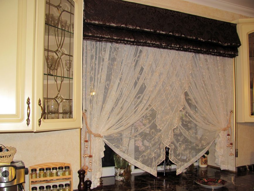 Tegen de achtergrond van witte tule zal de donkere opengewerkte lambrequin er prachtig uitzien