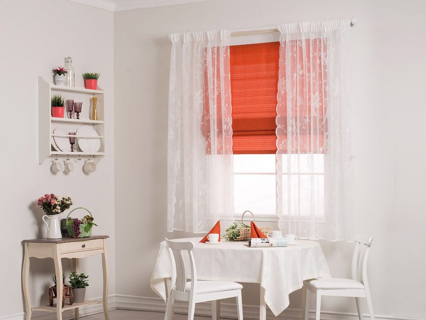 - Tule met vouwgordijnen. Deze combinatie wordt als zeer praktisch beschouwd: Romeinse gordijnen (zien er geweldig uit en als een onafhankelijk kenmerk) beschermen tegen nieuwsgierige blikken in het donker, tule - in de middag.