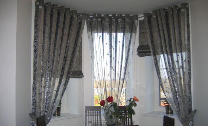 - Gordijn voor erkers. Erker - een richel van een muur met een veelzijdige of halfronde vorm. Tule voor dit type venster is meestal de maximale lengte. Met zijn hulp wordt het effect van luchtigheid en lichtheid gecreëerd. Een dergelijke tule kan uit een of meer elementen bestaan.