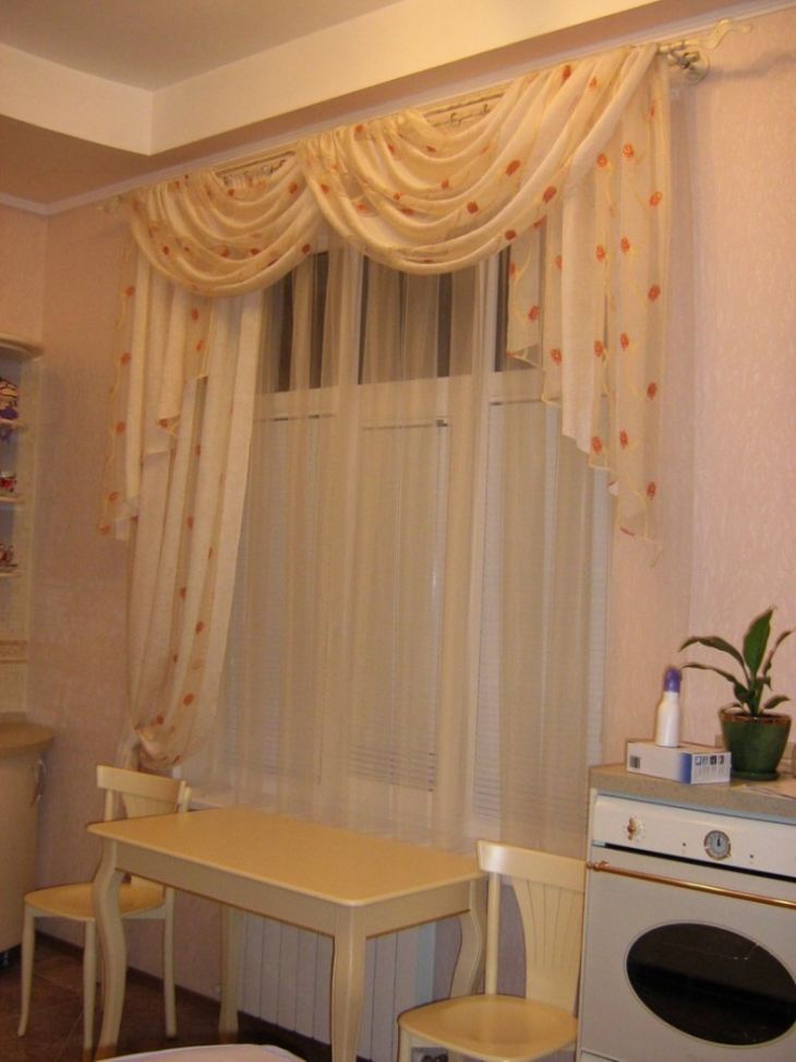 Het gordijn voor het raam moet worden gecombineerd met alle elementen in het interieur van de keuken