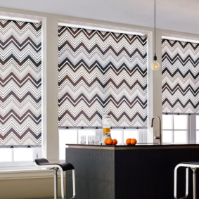 - Als je ongebruikelijk wilt toevoegen aan het interieur, gebruik dan gekrulde rollen. De onderkant van dergelijke gordijnen is niet gelijkmatig, maar heeft een bepaalde vorm. Het kunnen vloeiende golven of scherpe hoeken zijn. Afhankelijk van het algemene concept van de keuken.
